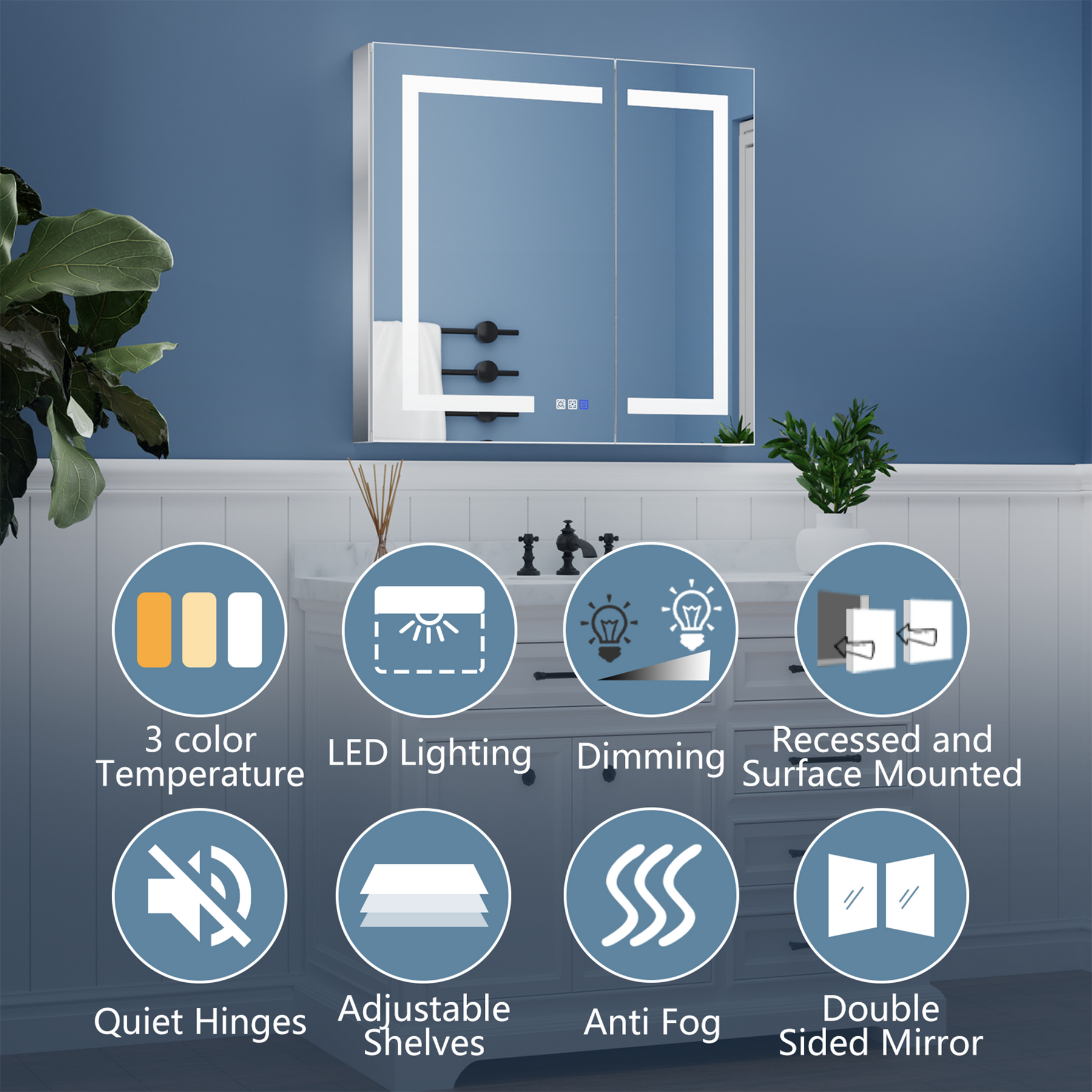 Gracefully elevate your bathroom or dressing area with the ExBrite Medicine Cabinet, where innovation meets style. The gleaming aluminum frame and crystal-clear, copper-free mirror exude modern elegance, while integrated LED lighting transforms any room into a serene oasis of clean lines and ambient light. Experience the luxury of tailored illumination and fog-free clarity, perfect for preparing yourself in genuine grandeur. With such refined functionality, this cabinet becomes an indispensable element of sophisticated living.