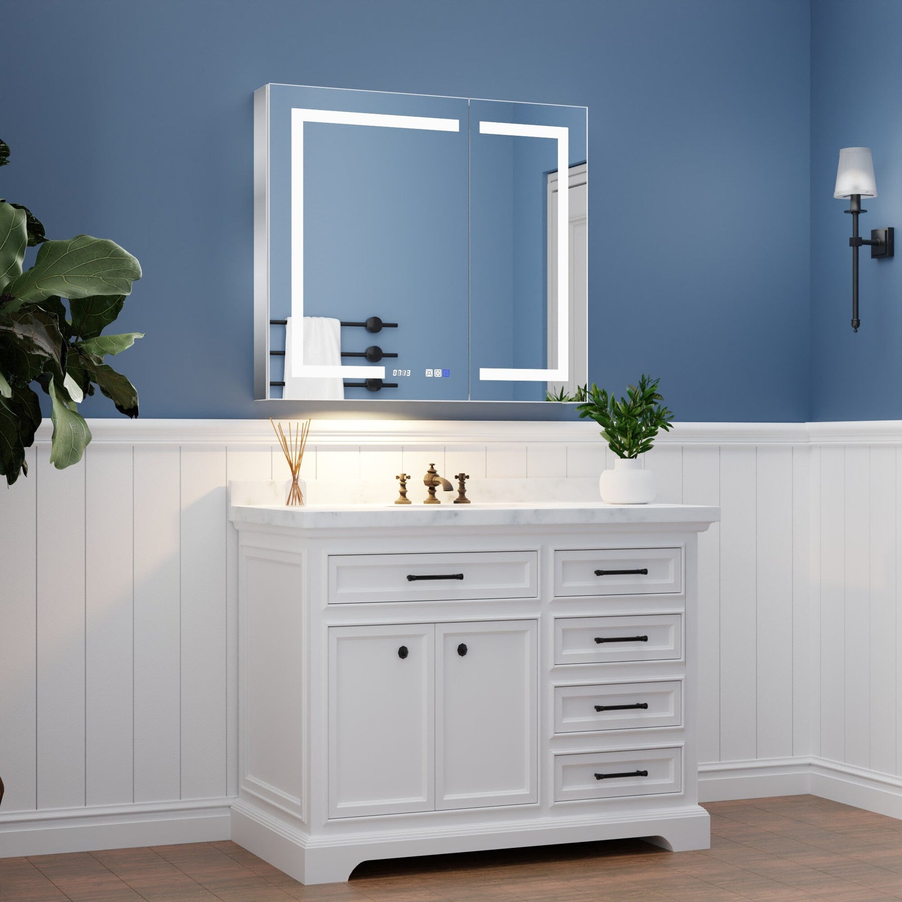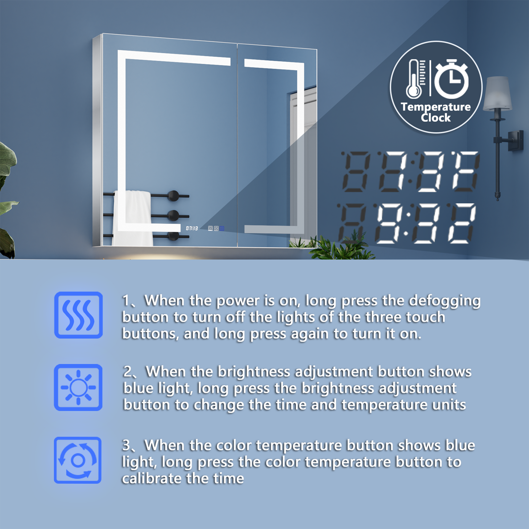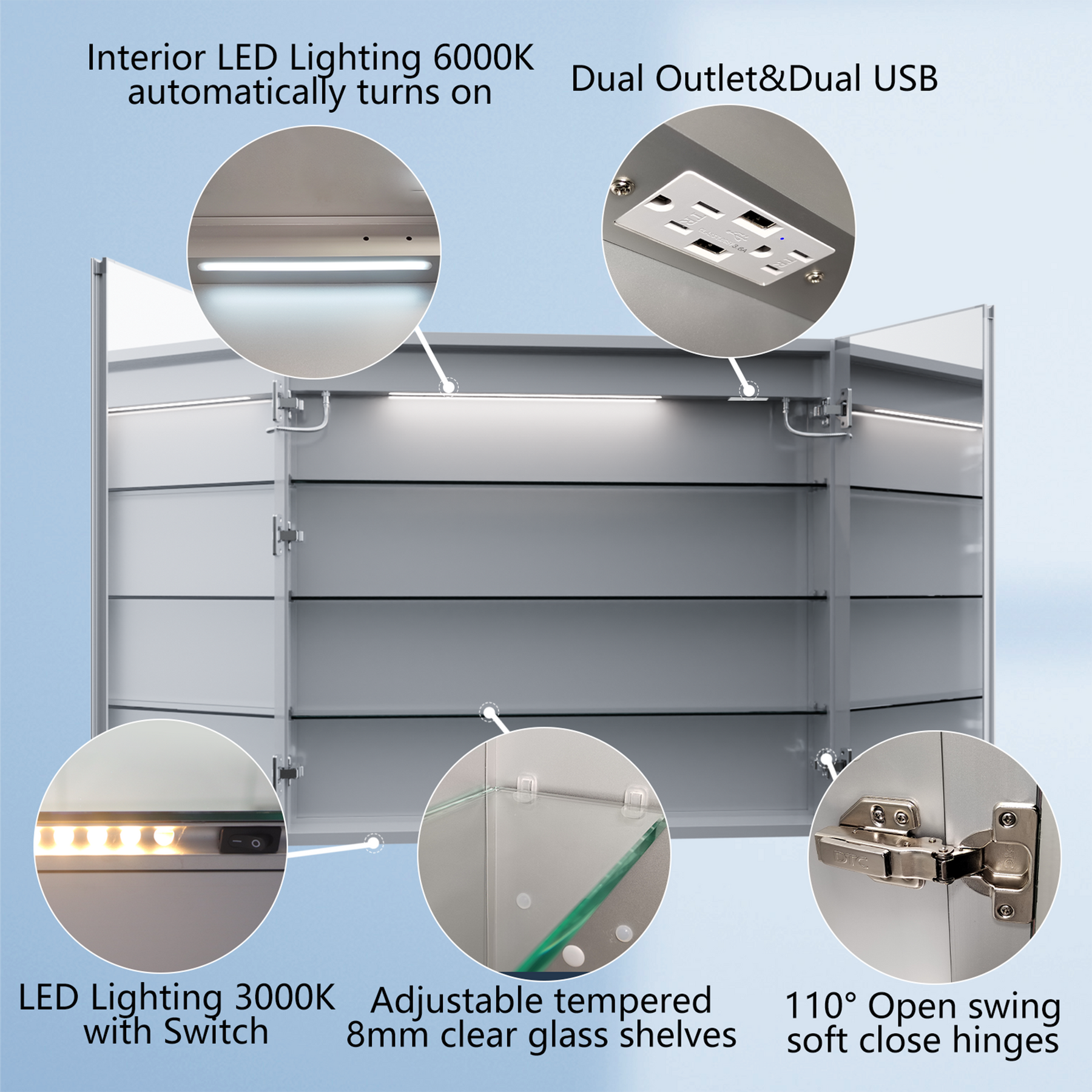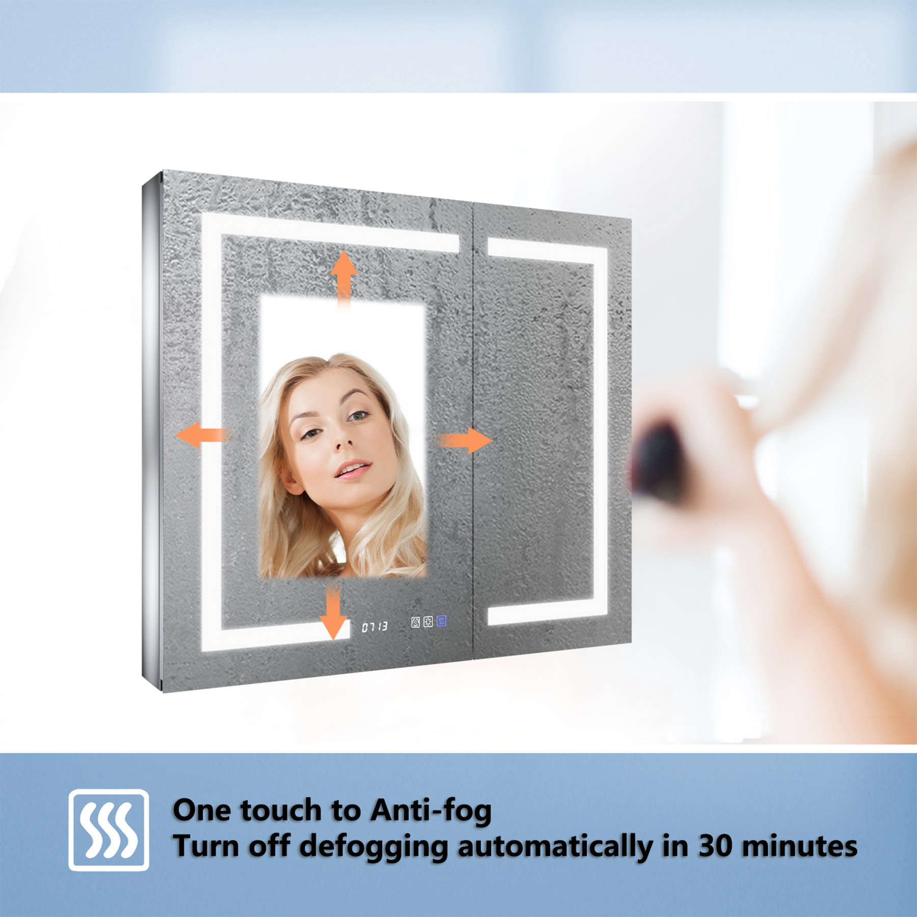 Revolutionize your bathroom with the ExBrite 36x32 LED Medicine Cabinet, featuring fog-free technology and energy-efficient LED lighting. This smart cabinet not only provides crystal-clear reflection but also integrates powerful convenience with built-in outlets and customized lighting.