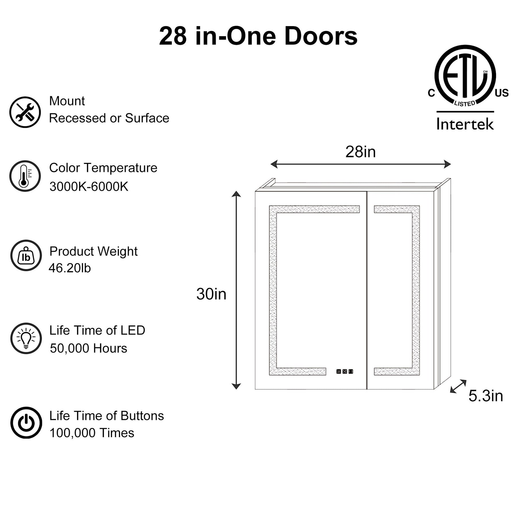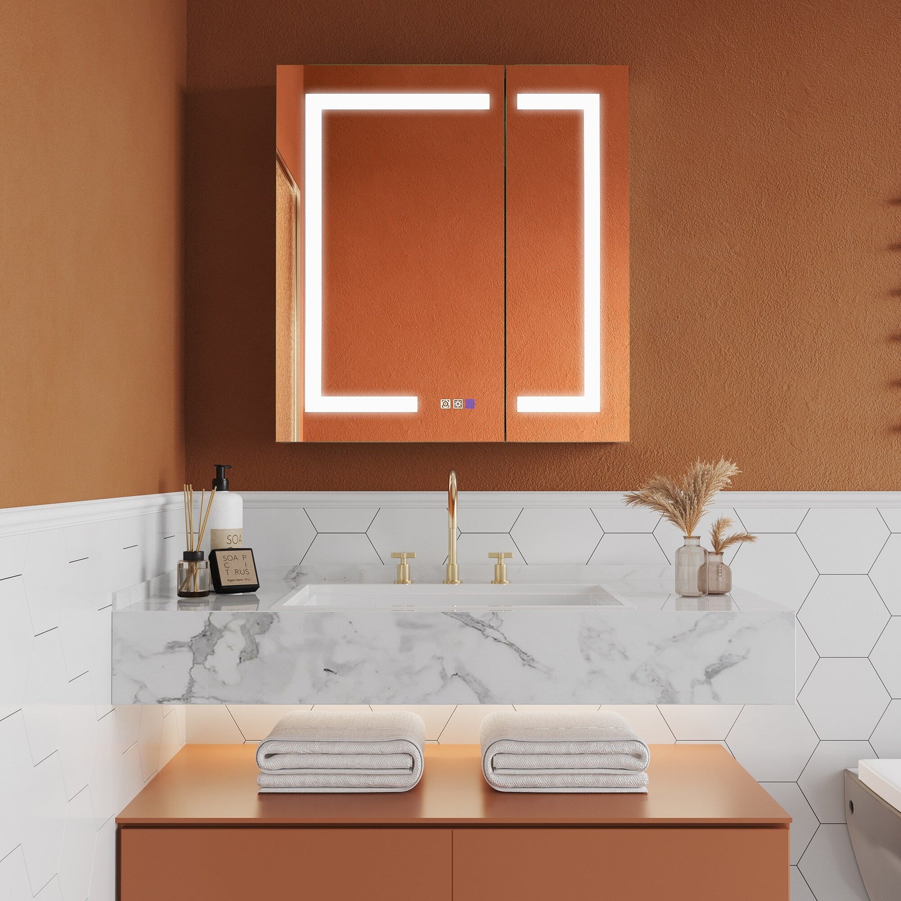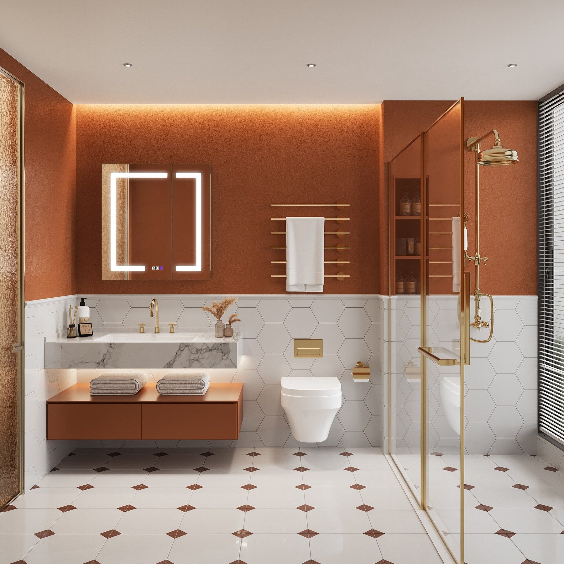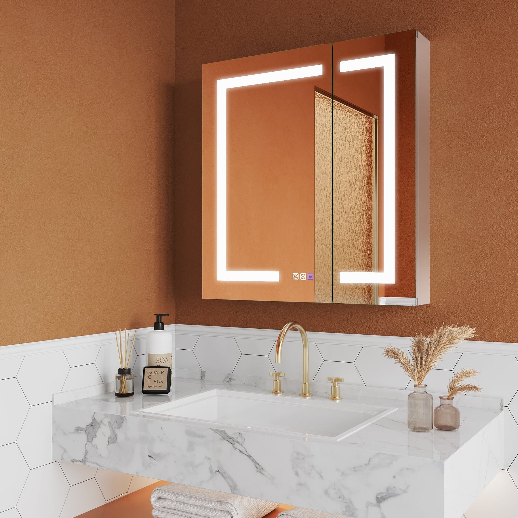 Enhance your bathroom with the ExBrite Opale 28x30 Mirrored Medicine Cabinet, featuring LED lighting and fog-free technology. Its sleek design offers ample storage with adjustable shelves and an energy-saving light system, making it a stylish and functional addition to your space.