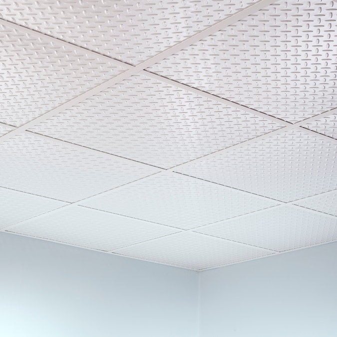 Transform your ceilings with the classic charm of tin for a fraction of the cost with these Diamond Plate Matte White PVC Drop Ceiling Tiles. Ideal for both remodeling and new construction, these tiles offer easy installation, durability, and a timeless design, perfect for any commercial or residential space.