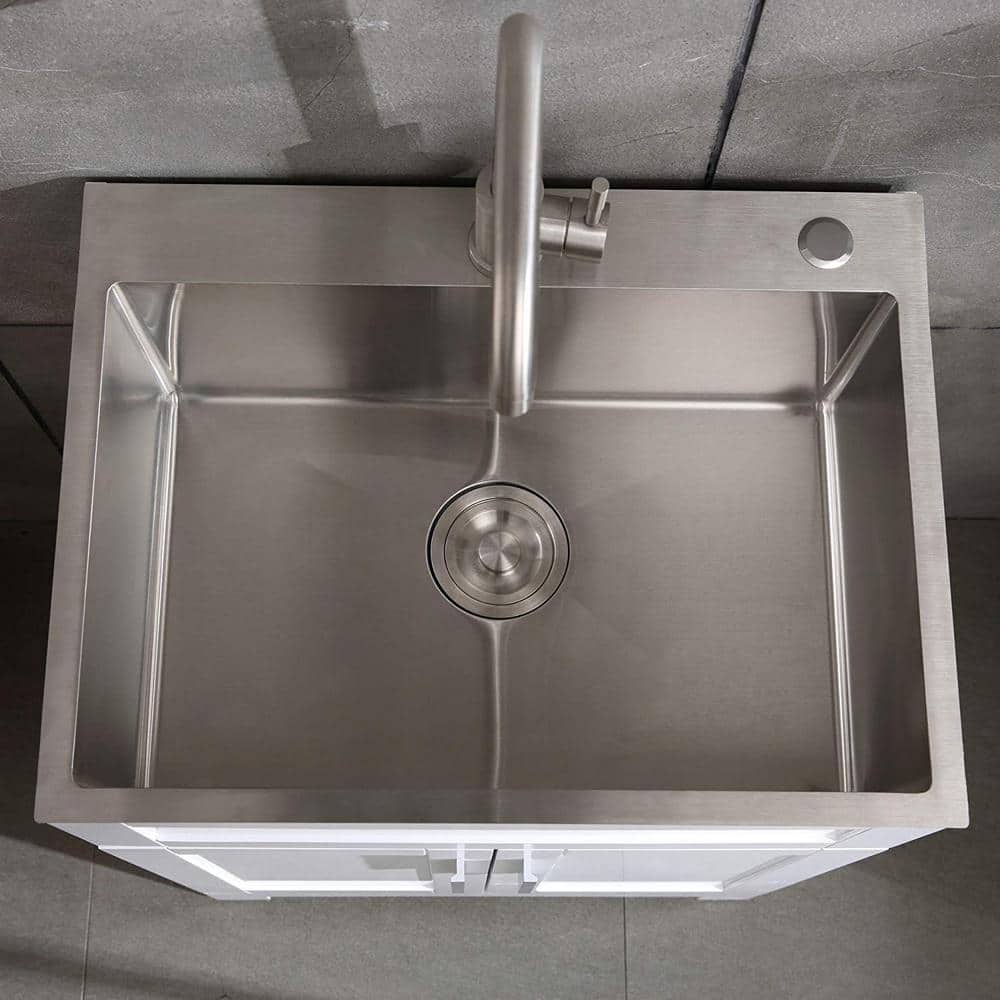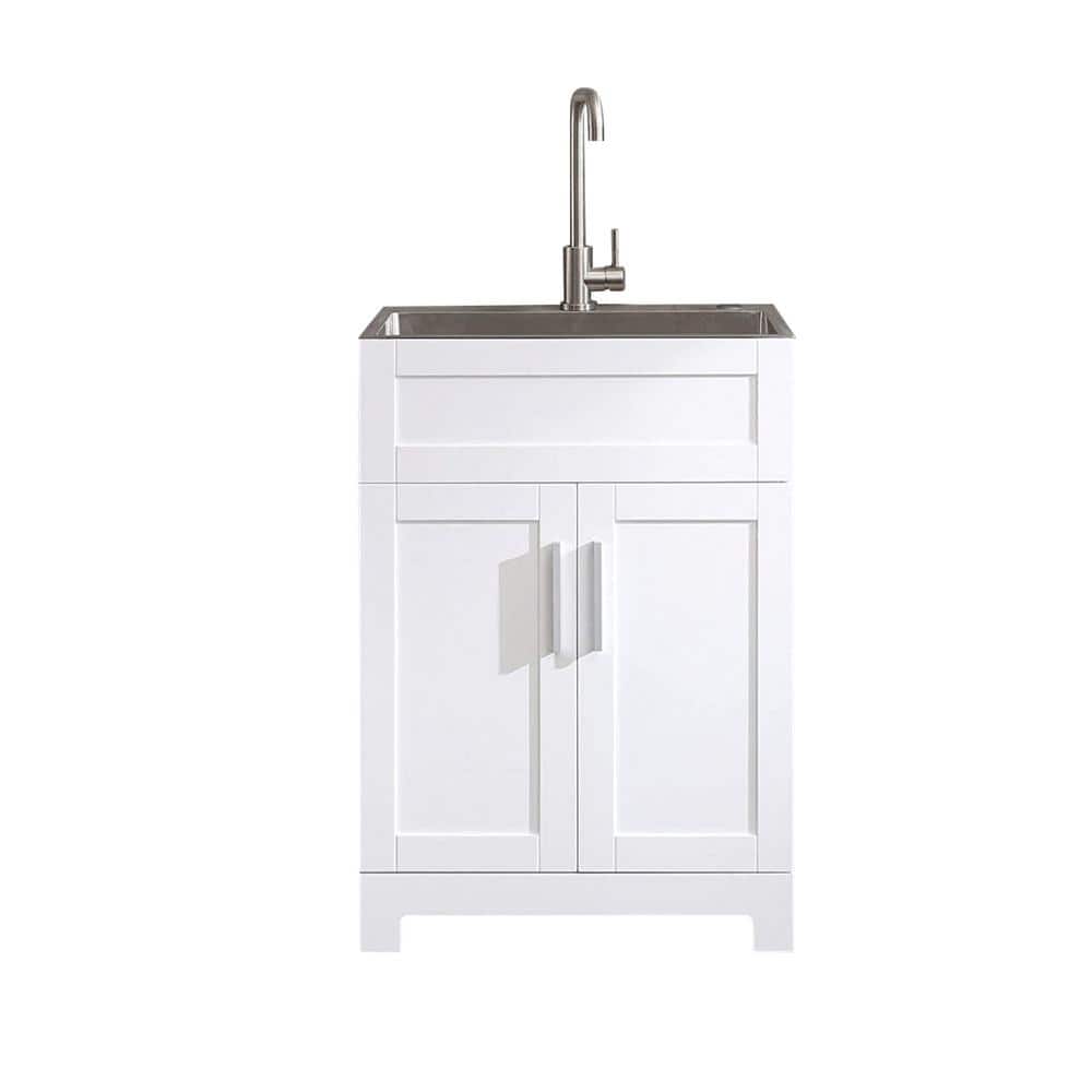 The FORCLOVER 23.5 in. Bath Vanity combines form and function, offering a sophisticated storage solution with an integrated utility sink. Its stainless steel top and brushed nickel fixtures complement contemporary interiors. Ideal for laundry rooms or compact bathrooms, this vanity provides both style and practicality.