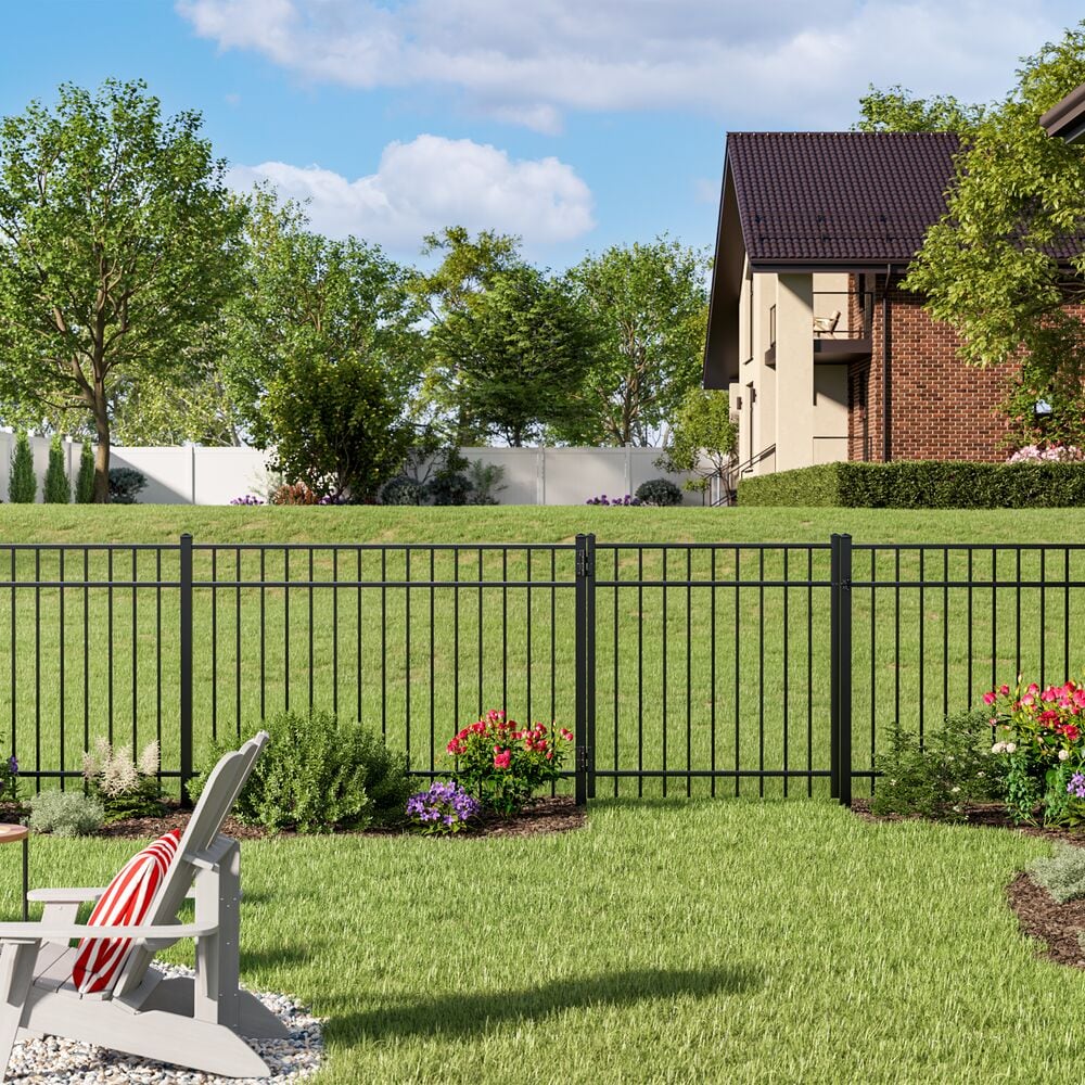 Embrace the art of boundary-setting with the Freedom New Haven Aluminum Fence Gate. This striking black gate serves as a portal of sophistication, effortlessly delineating spaces with its graceful silhouette and enduring structure. The standout flat-top, spaced-picket design accentuates entranceways, inviting guests with a subtle invitation. Pair it with lush climbing foliage to artistically soften its lines, transforming functional fencing into a picturesque entrance and making an elegant statement in any landscaped setting.