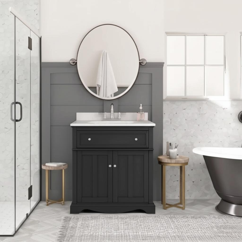 The Fremont Single Sink Vanity combines timeless design with modern functionality. Featuring a sleek black finish, engineered Carrara marble top, and soft-close doors, this vanity is perfect for elevating your bathroom decor.