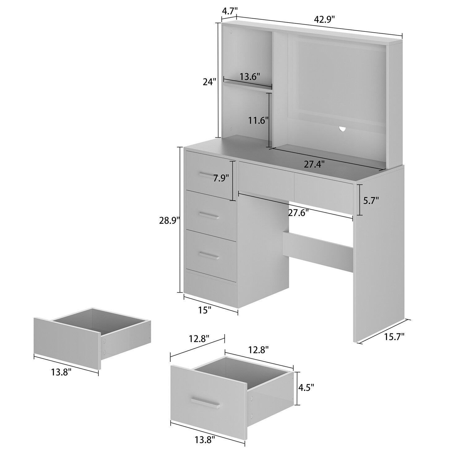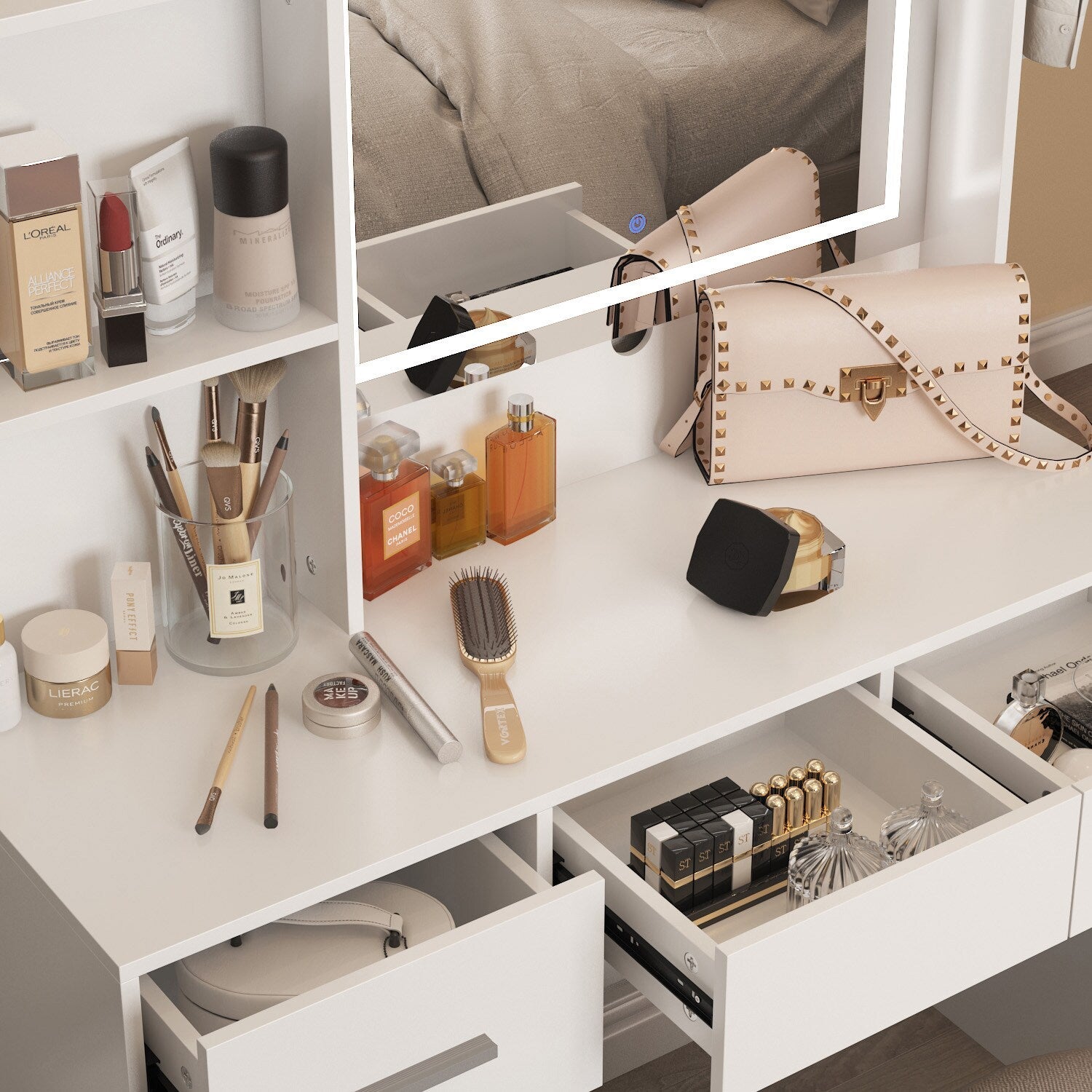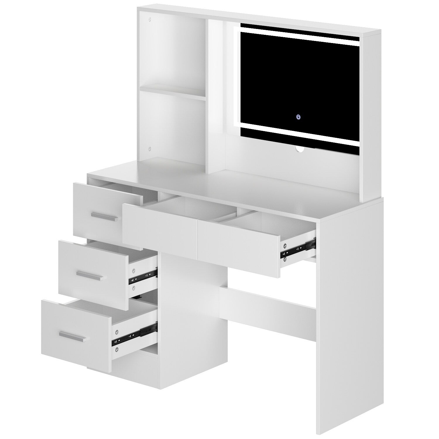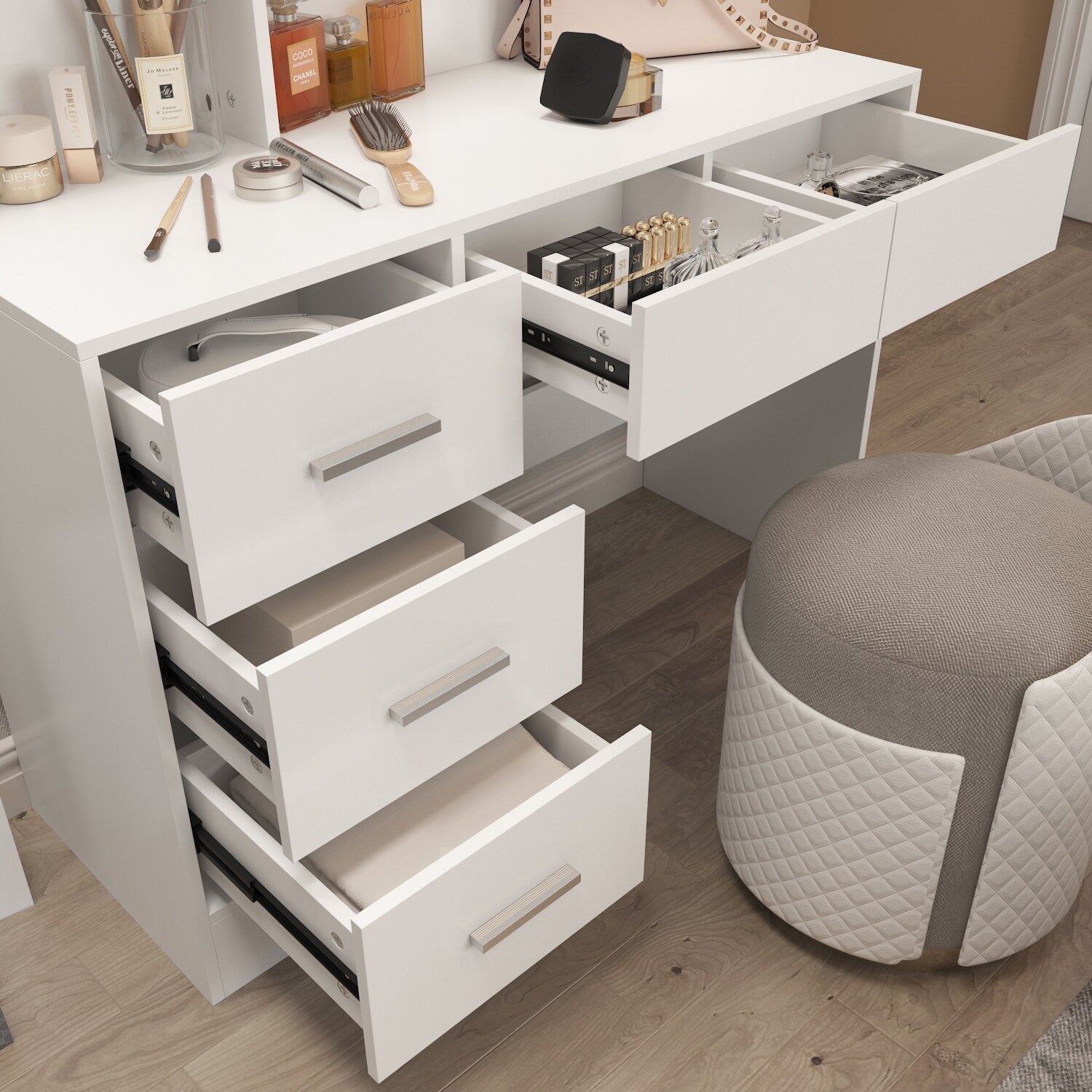 • Ample Storage: Features five drawers and two open storage cabinets to easily store cosmetics, jewelry, and skincare products.