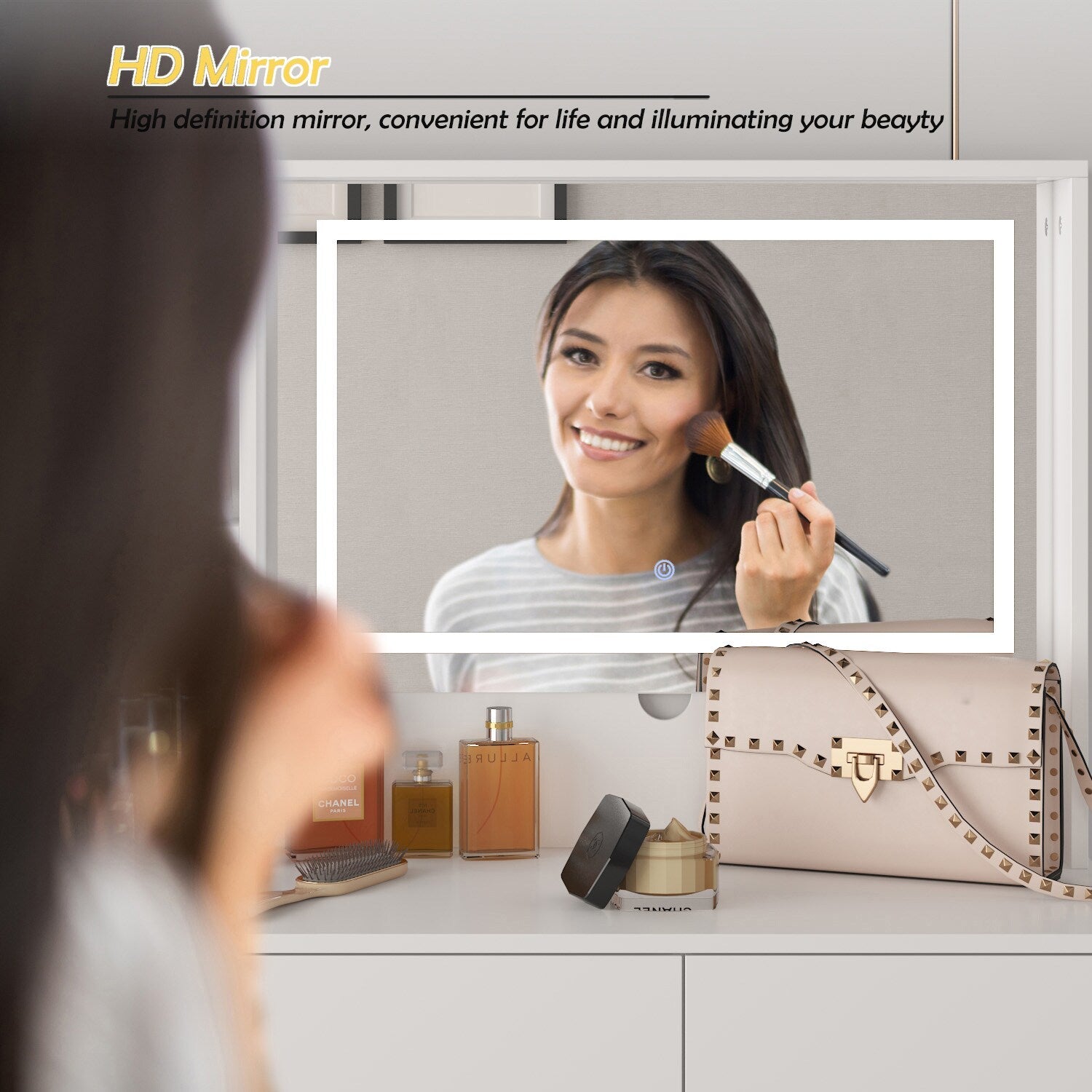 Transform your daily beauty routine into a luxurious experience with this stunning makeup vanity. Its contemporary white finish and sliding mirror design create an inspiring focal point in any room. Imagine styling it with delicate vases or a chic table lamp to enhance its modern charm. This vanity is not just a piece of furniture; it's a testament to graceful living and refined aesthetics, perfect for any sophisticated space.