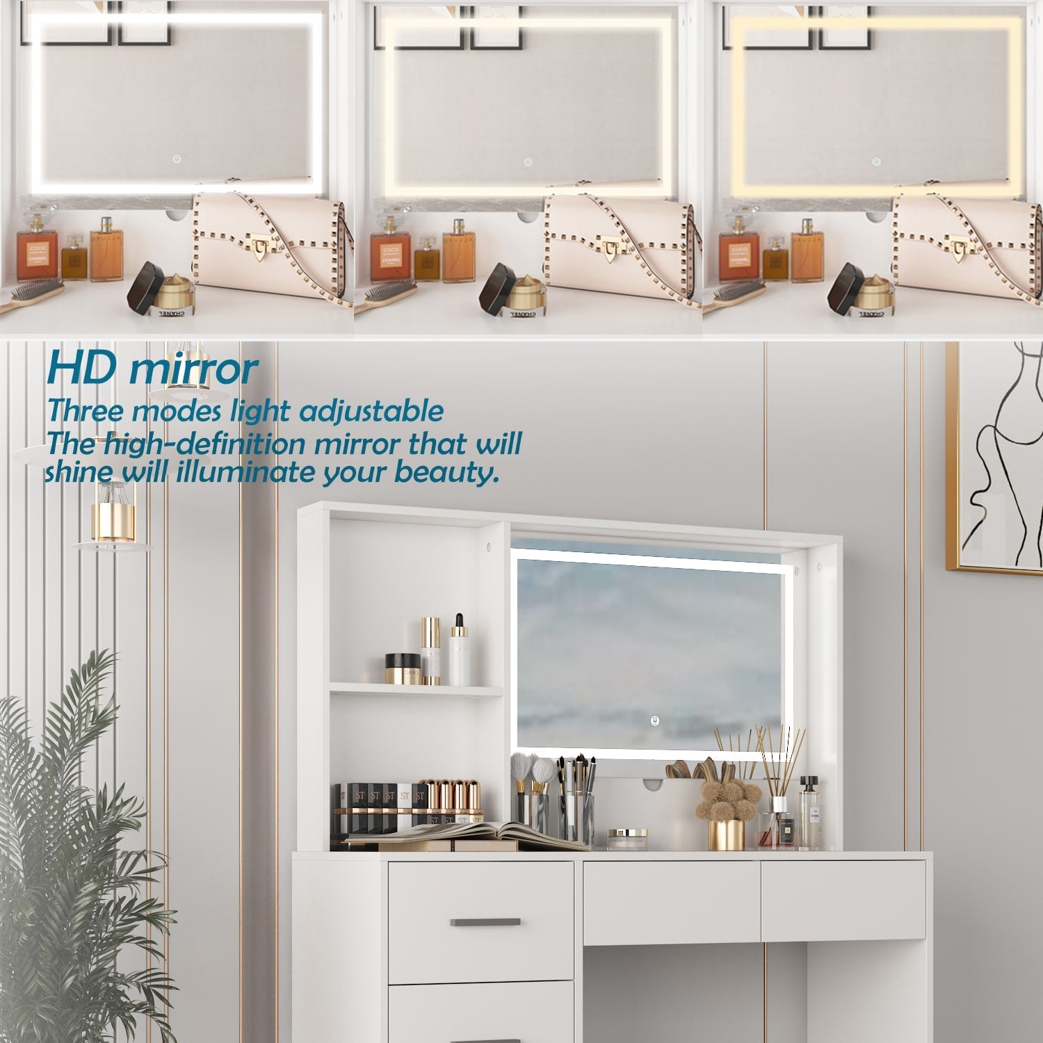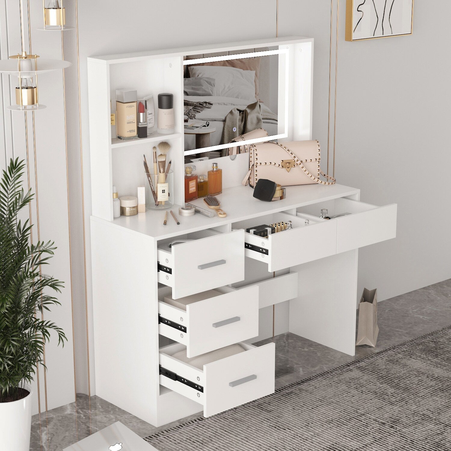 FUFU&GAGA Contemporary Makeup Vanity Table with Sliding Mirror and Adjustable Lights - White, 5 Drawers, 2-Tier Storage Cabinets, Durable MDF Material
