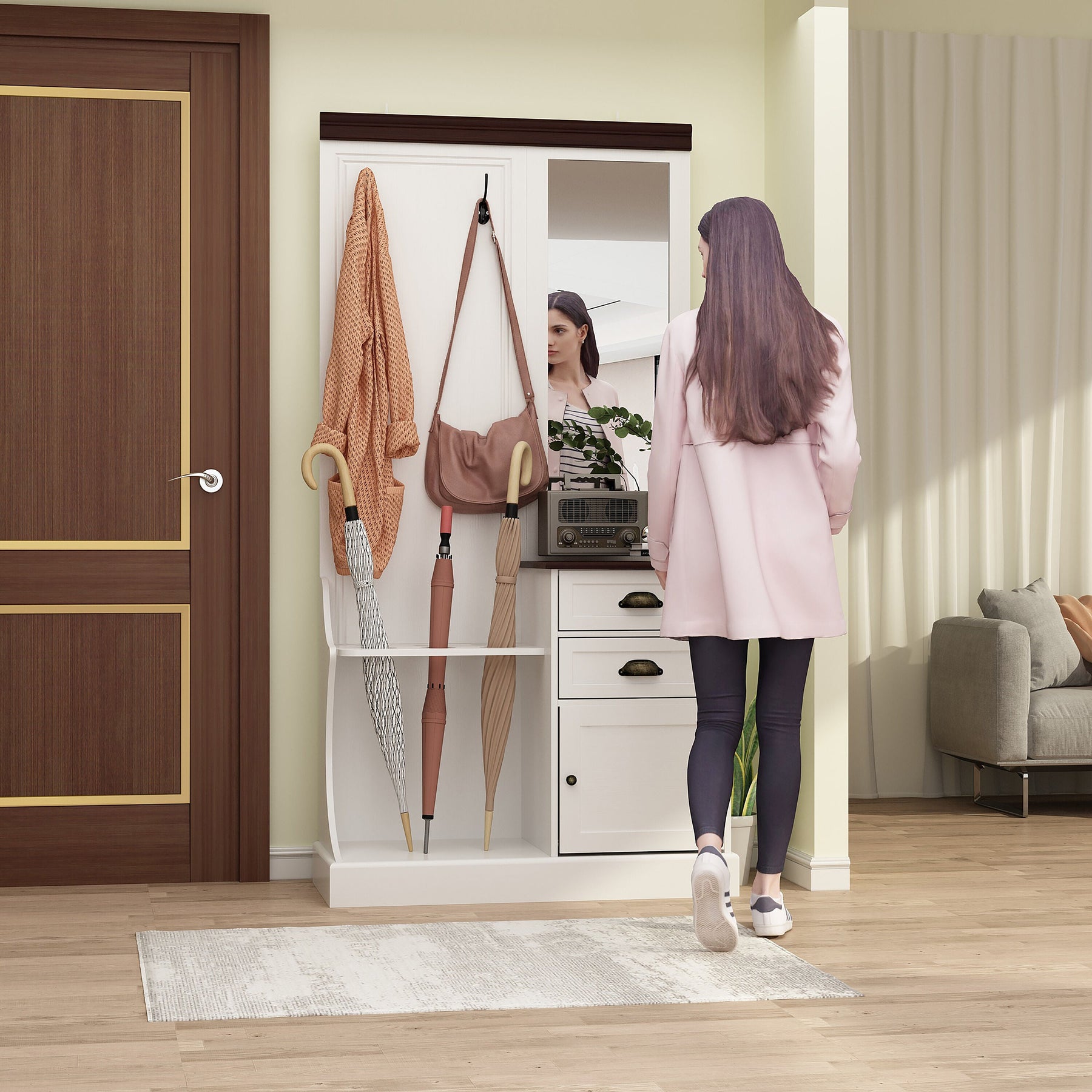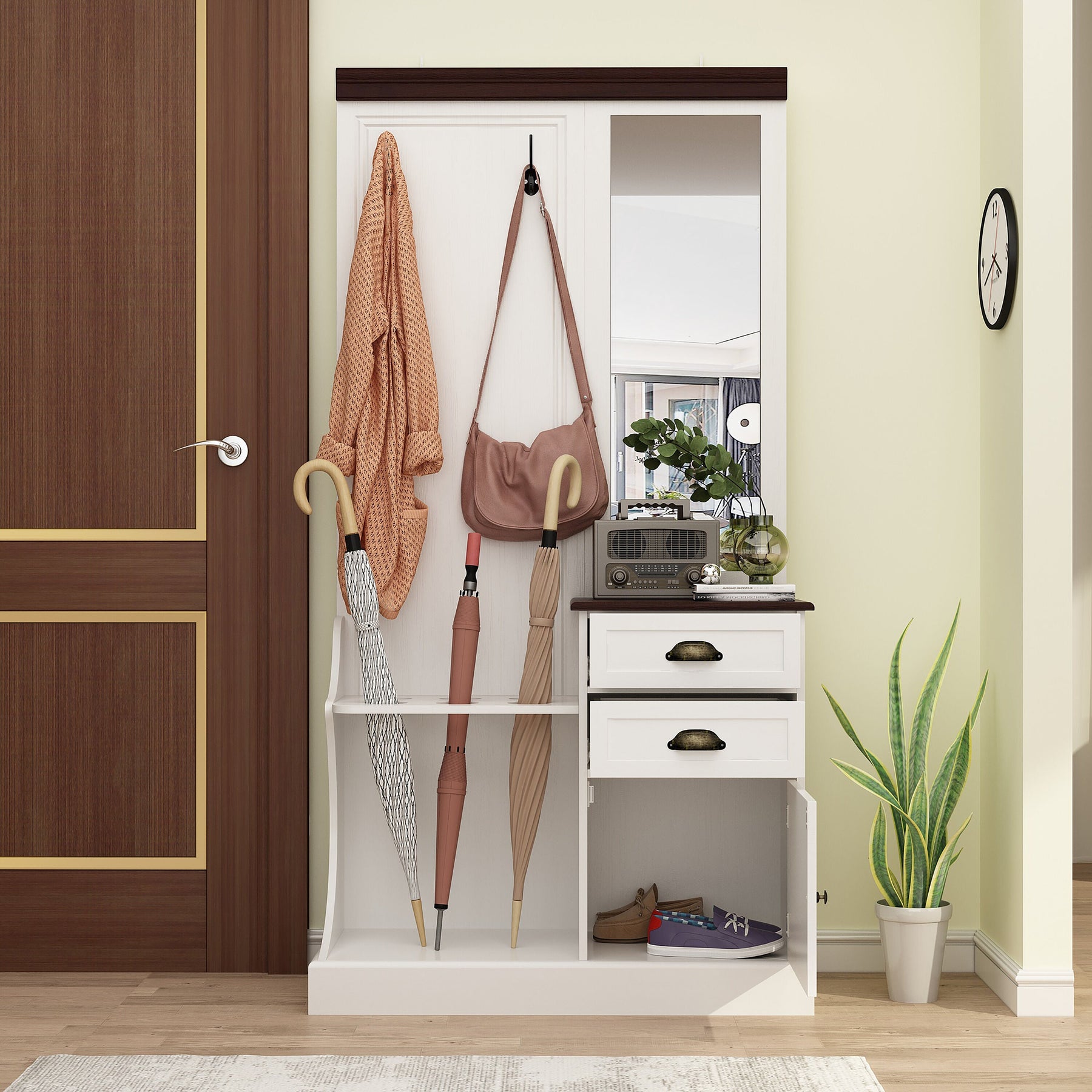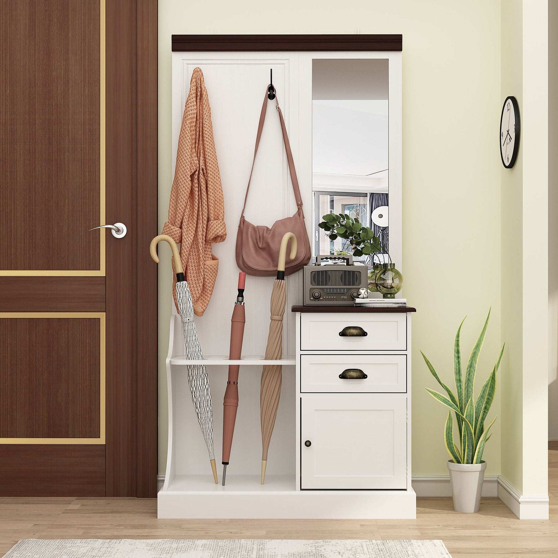 Transform any entryway with this modern hall tree, a harmonious balance of form and function. The integrated mirror and sleek white finish make it a standout piece, adding a touch of elegance while serving practical needs. Imagine styling it with a vintage umbrella and a woven basket on the top shelf; it’s homey yet sophisticated. This piece is not just furniture, but a statement of tasteful simplification in creating inviting, clutter-free spaces.