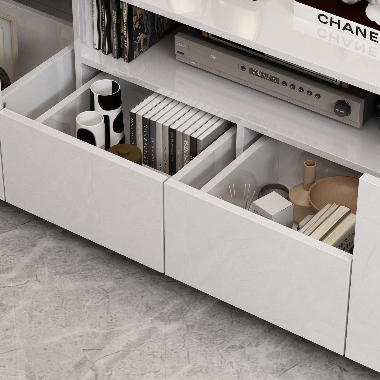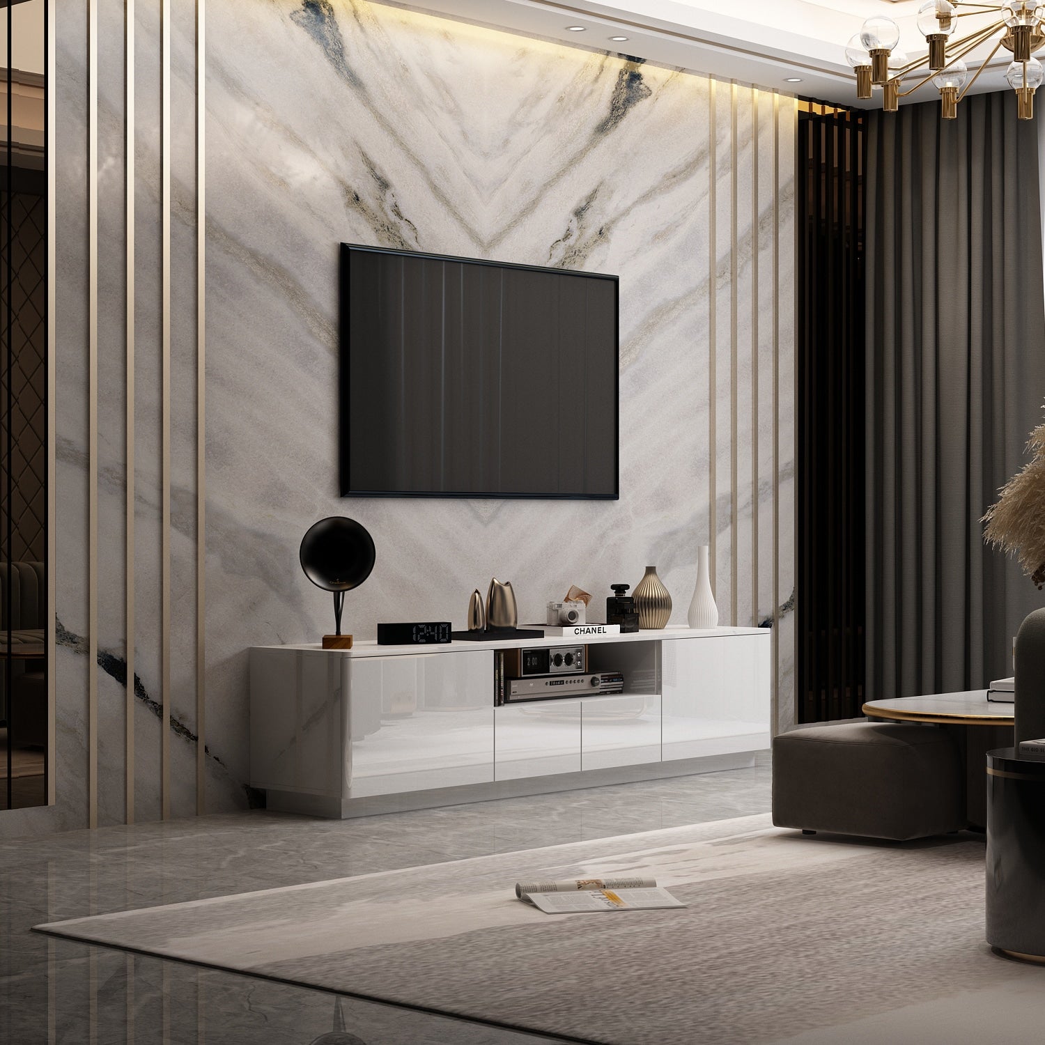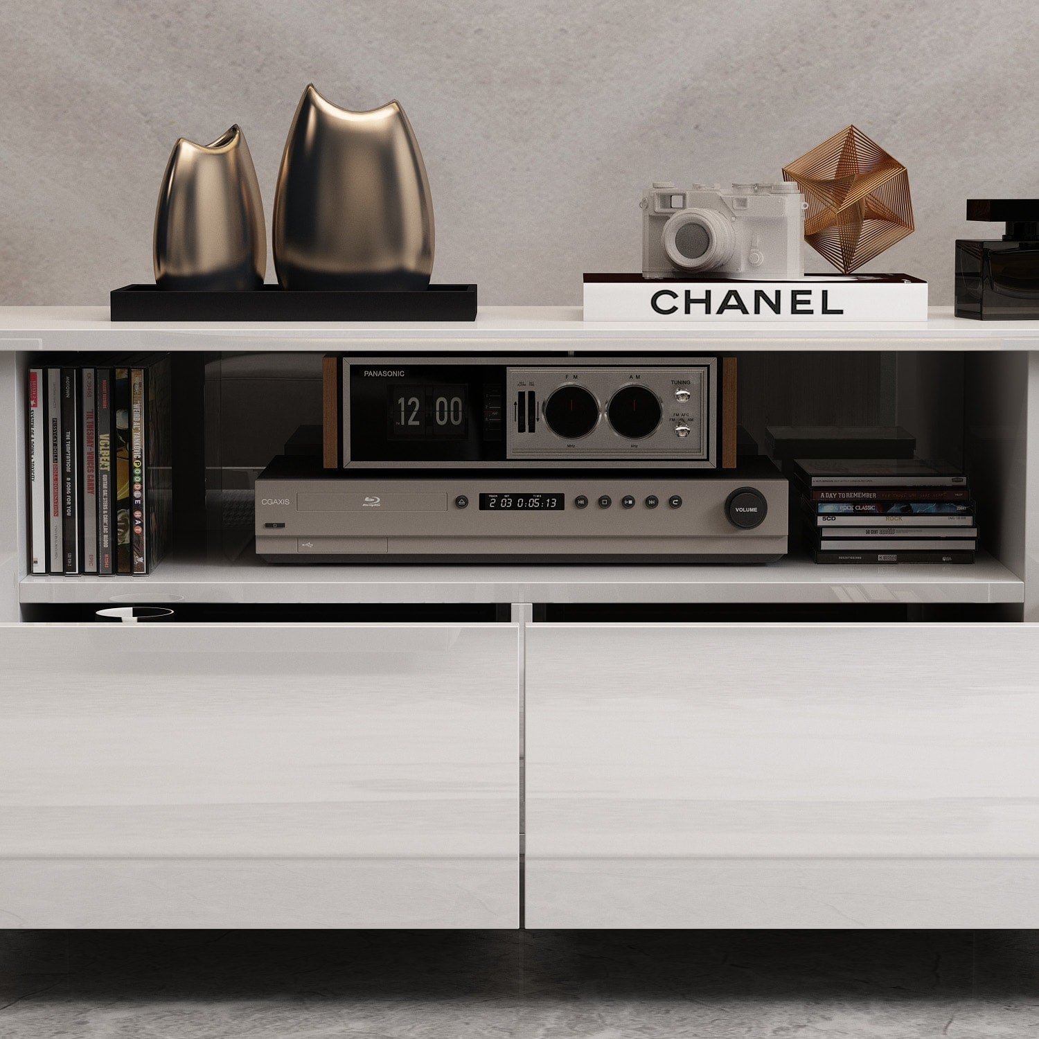 Transform your living room into a haven of style and serenity with this sleek TV stand. The high-gloss finish captures the sophistication of modern design, while the subtle glow of its tucked-away lights creates an inviting ambiance. Envision this piece paired with minimalist decor, its drawers seamlessly concealing gaming consoles and remotes. This TV stand is more than a media centerpiece; it's a gateway to a luxurious living experience.