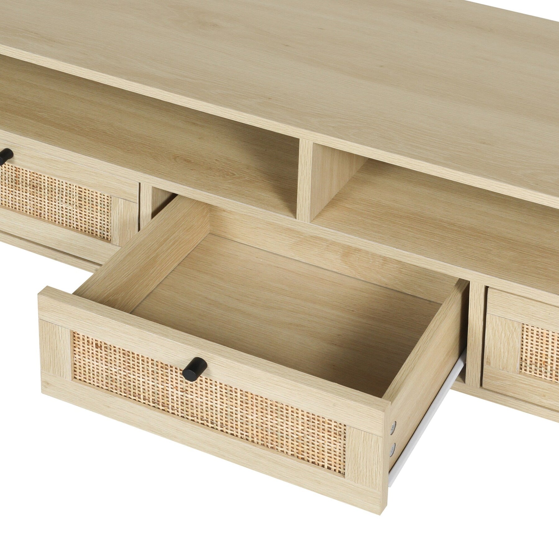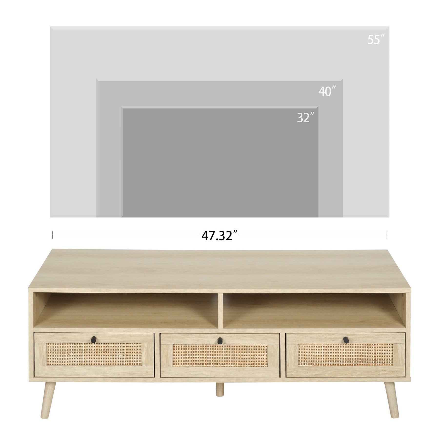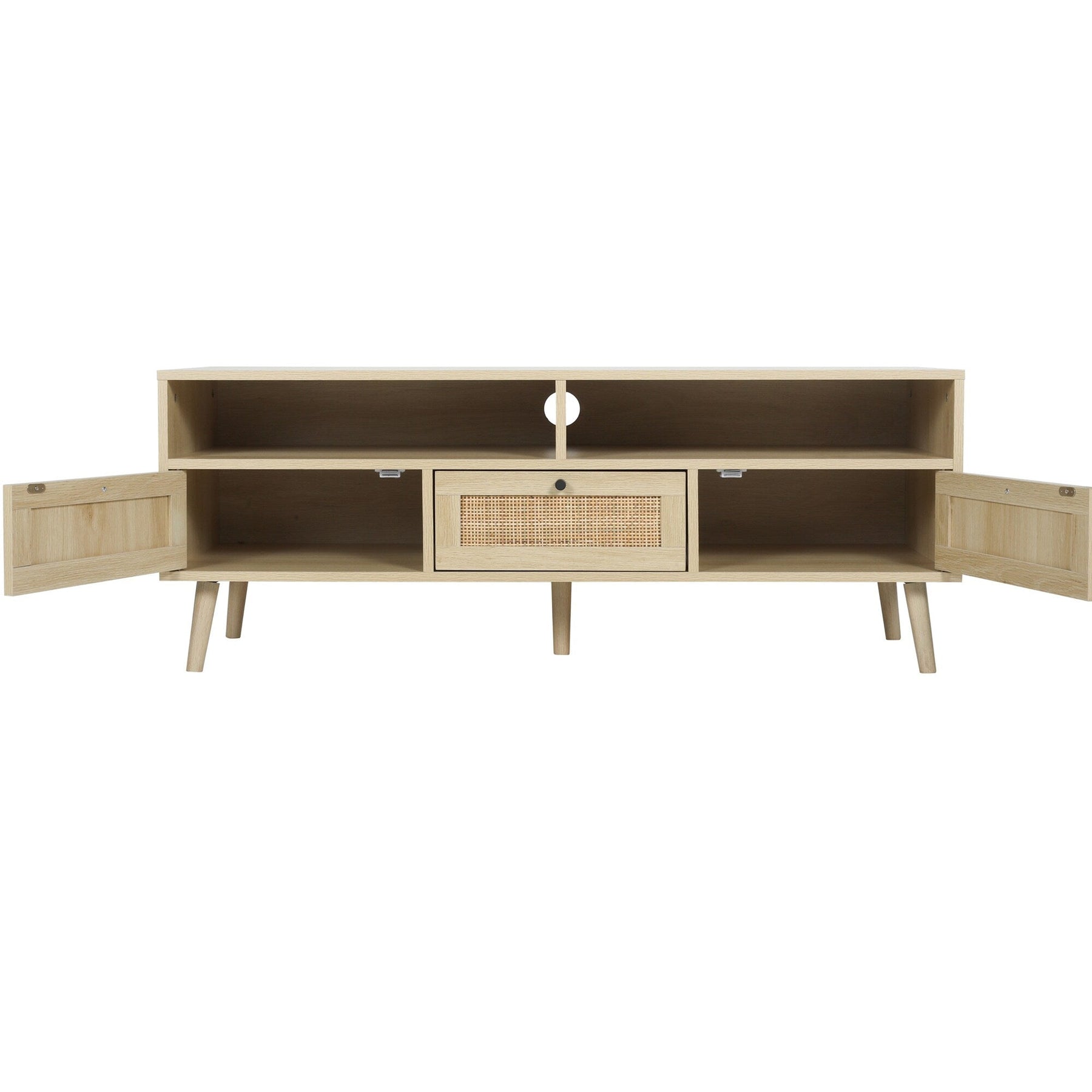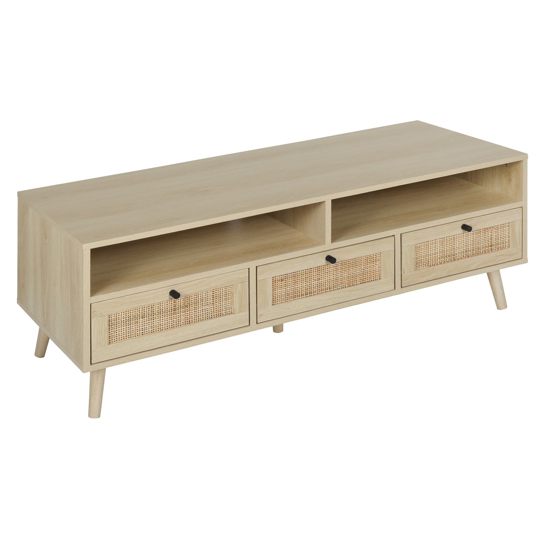 Elevate your living space with this modern oak TV cabinet, designed to accommodate TVs up to 55 inches. The fusion of natural rattan accents and sturdy wood construction provides a timeless elegance and functionality, enhancing both storage and style in your home.