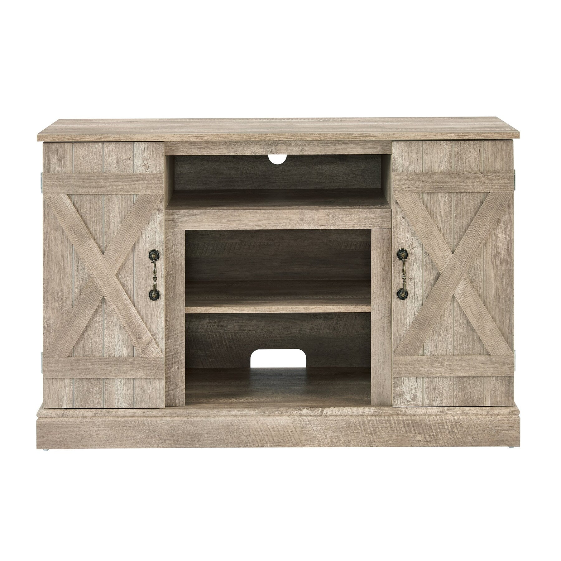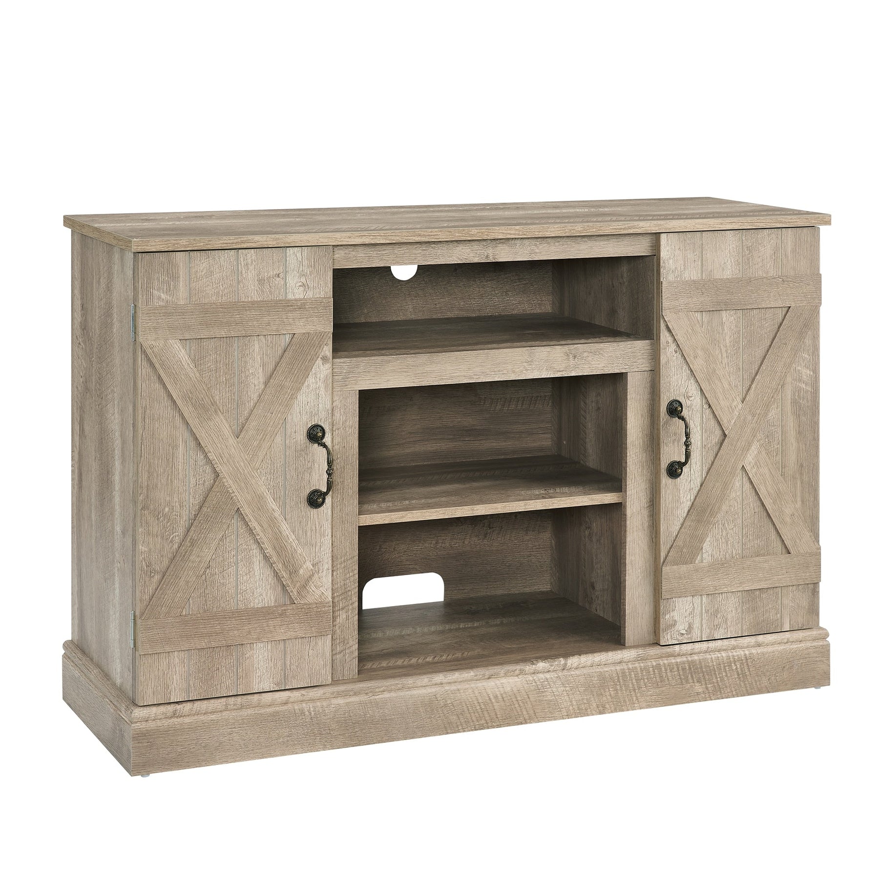 Designed with a charming farmhouse aesthetic, this TV cabinet offers both function and style with its classic rustic touches. Its light gray finish, coupled with decorative barn doors, makes it a versatile piece that enhances any living space while accommodating TVs up to 50 inches.