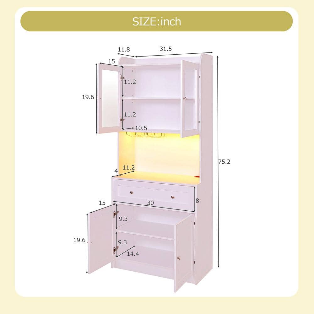 FUNKOL 31.5 in. x 15.75 in. x 70.87 in. White Classic MDF Kitchen Cabinet with Light Charging Stand Microwave Shelf & 1-Drawer