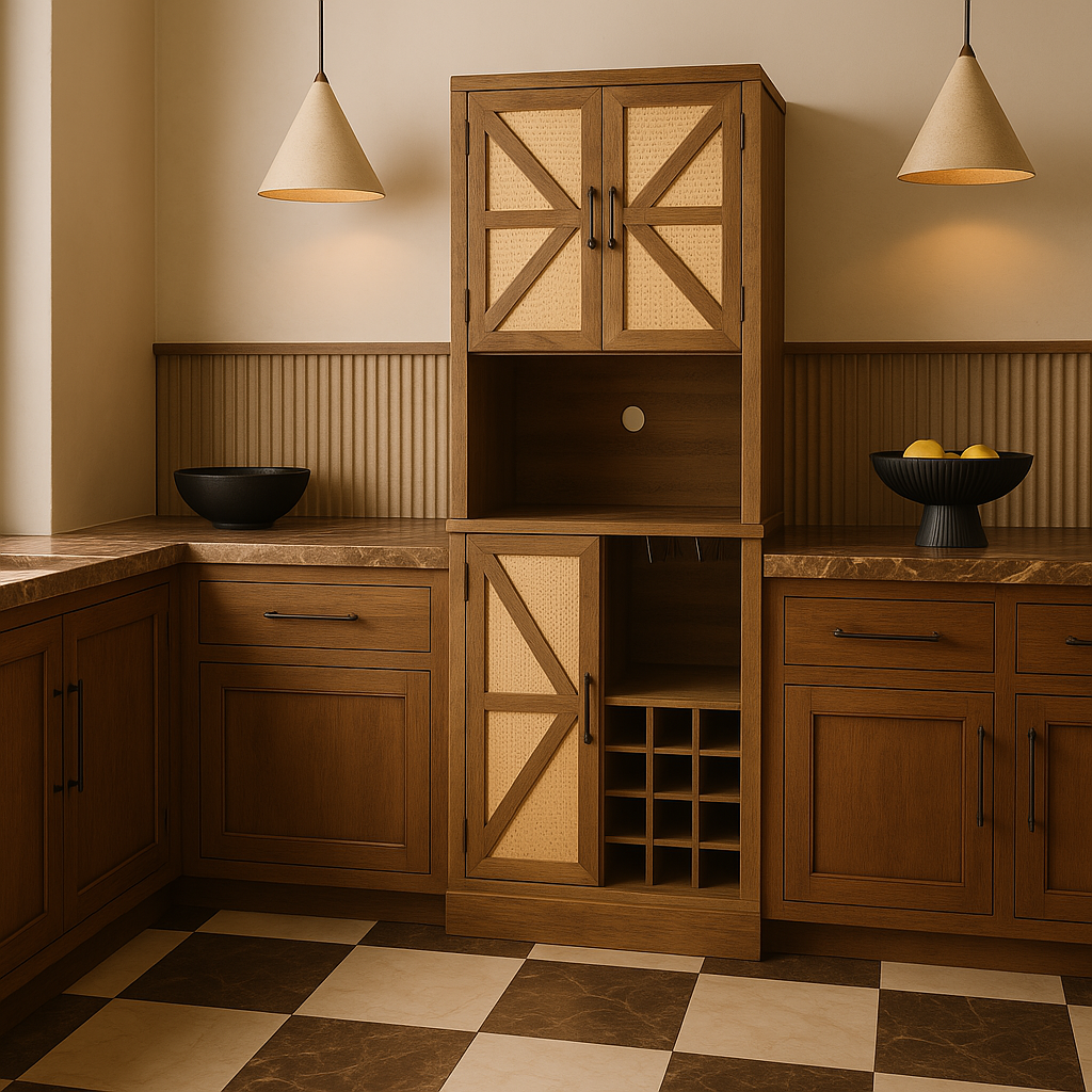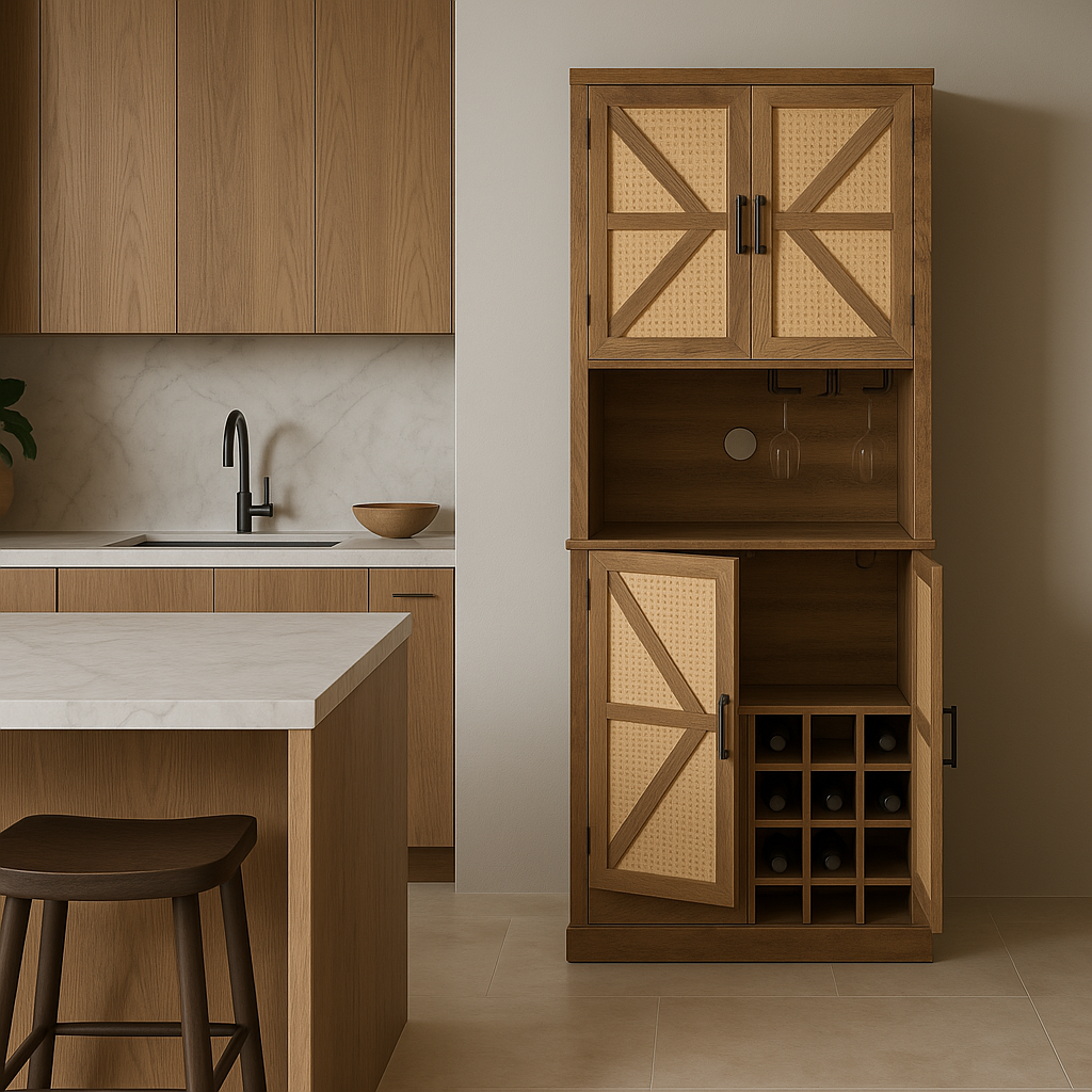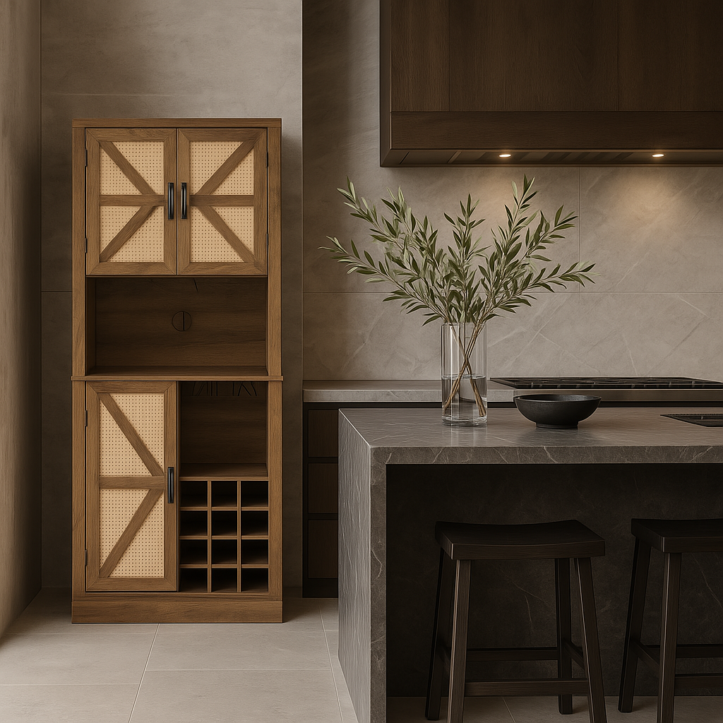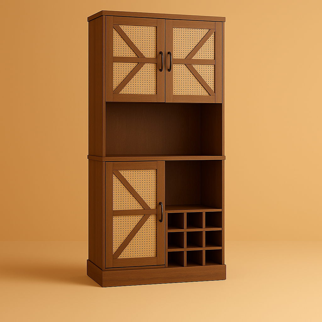 The FUNKOL Oak Wooden Wicker Wine Cabinet combines rustic charm with practical functionality. Featuring a microwave shelf, wine storage compartments, and plug holes for appliances, this cabinet is perfect for organizing your kitchen or dining area.