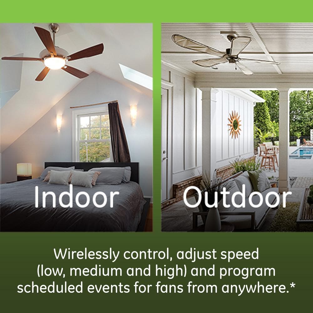 The GE Enbrighten Z-Wave Plus In-Wall Smart Fan Control lets you wirelessly manage and schedule ceiling fan speeds with a compatible hub. Designed for indoor installation with neutral wire required, it includes white and light almond paddles and supports voice control via Alexa or Google Assistant through select hubs.