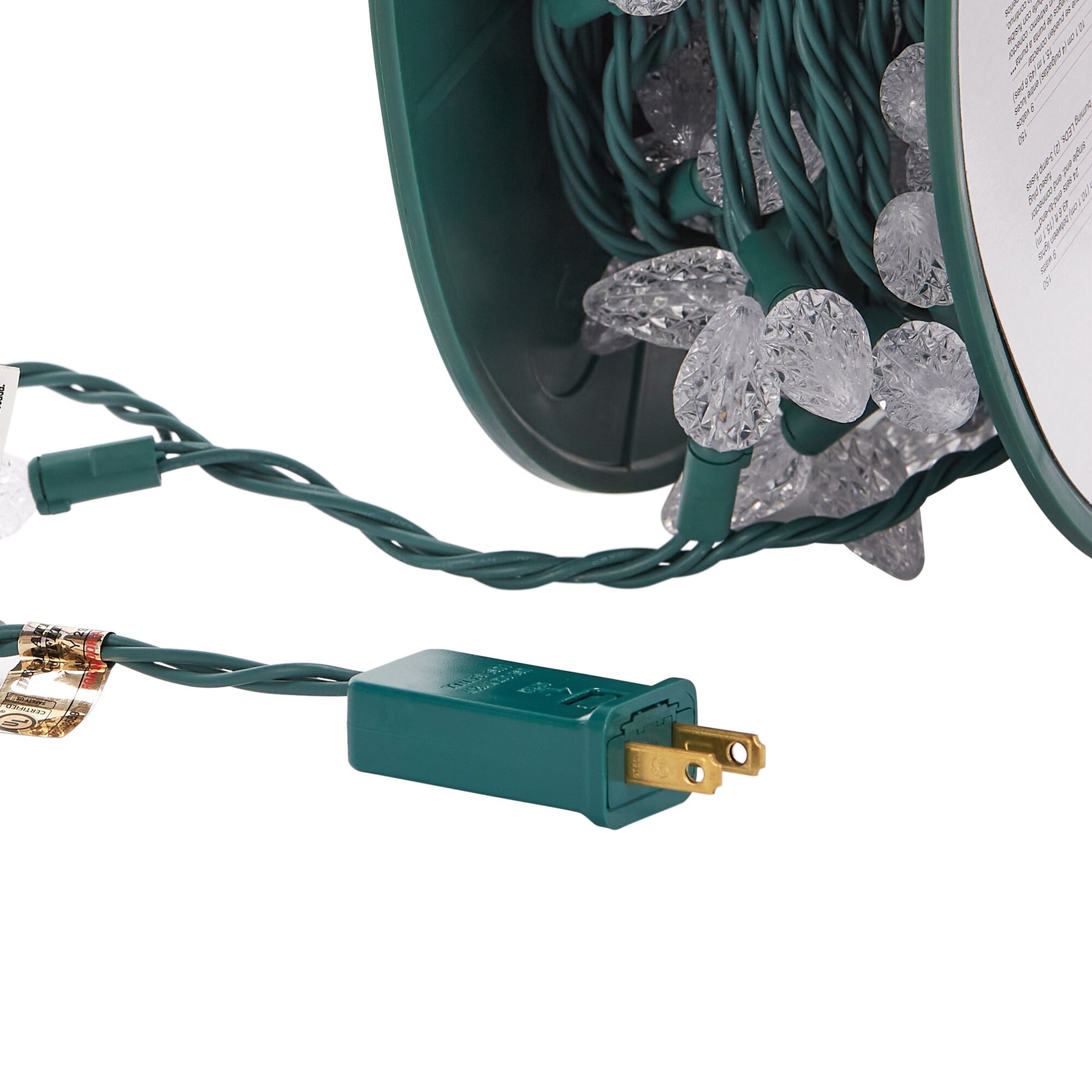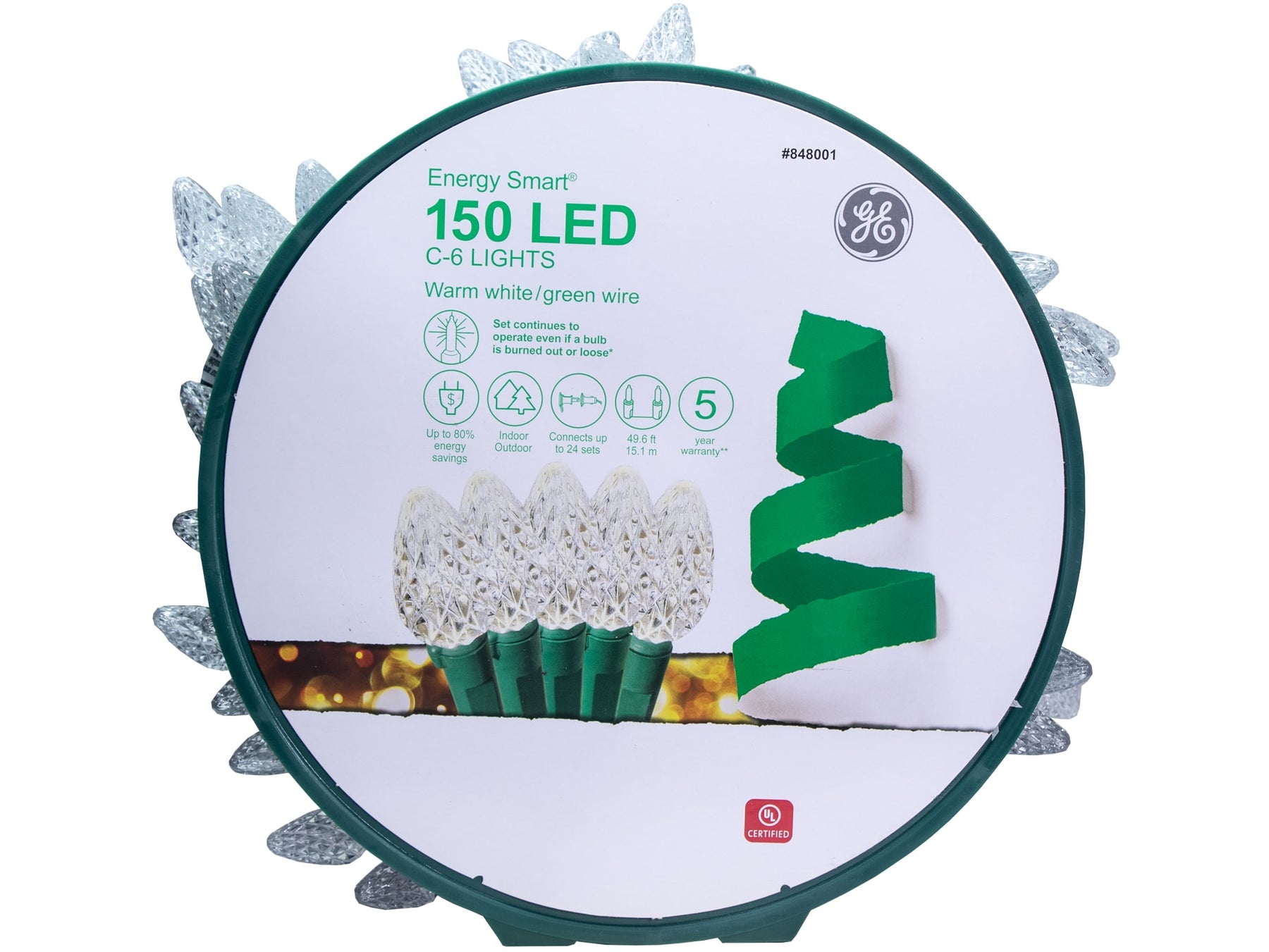 Brighten your holidays with GE Energy Smart C6 LED string lights. This 49.6-ft set features 150 warm white faceted bulbs on a green cord, built to keep shining even if a bulb is loose or burns out and suitable for indoor or outdoor use.