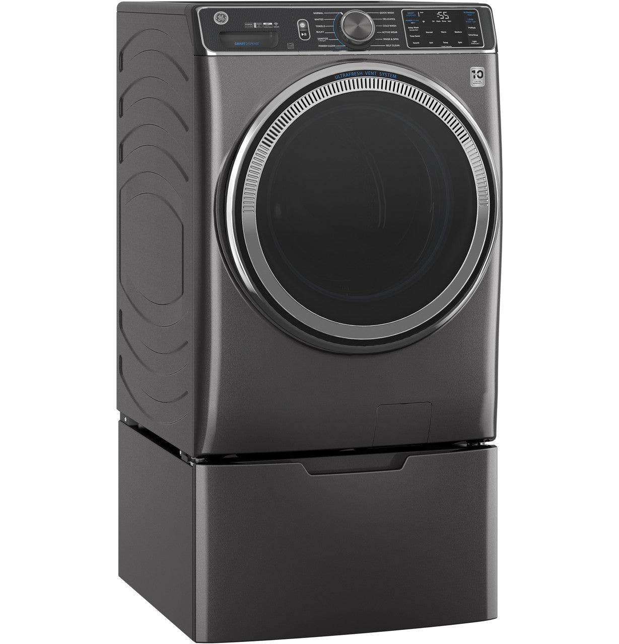This GE front-load washer delivers a spacious 5.0 cu ft capacity, UltraFresh Vent System with OdorBlock to keep the drum fresh, and ENERGY STAR efficiency. SmartDispense automatically meters detergent, while built-in WiFi and PowerSteam tackle tough stains in a sleek Sapphire Blue finish.