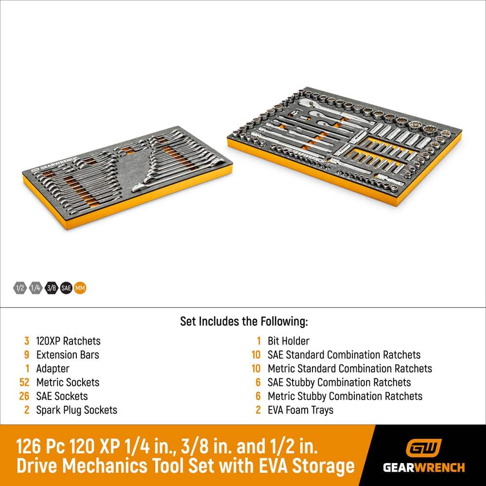 The GEARWRENCH 126-Piece Mechanics Tool Set is an essential collection for professionals and serious DIY enthusiasts alike. Featuring innovative 120XP ratchets with a 3° swing arc for maximum precision in tight spaces, this set provides quick access with SAE and metric sizes stored in high-quality EVA foam with clear size markings.