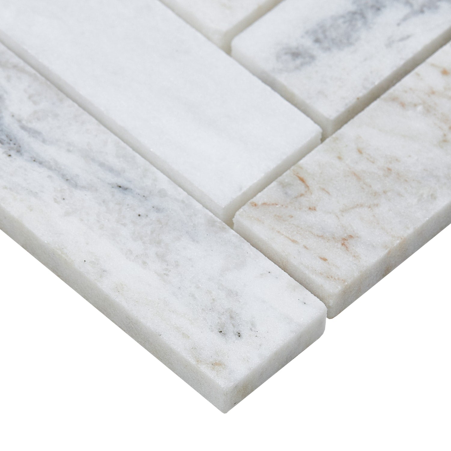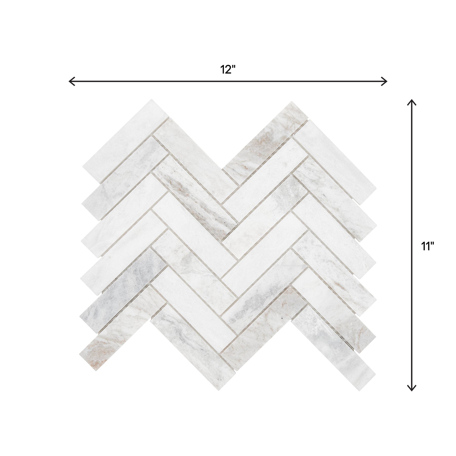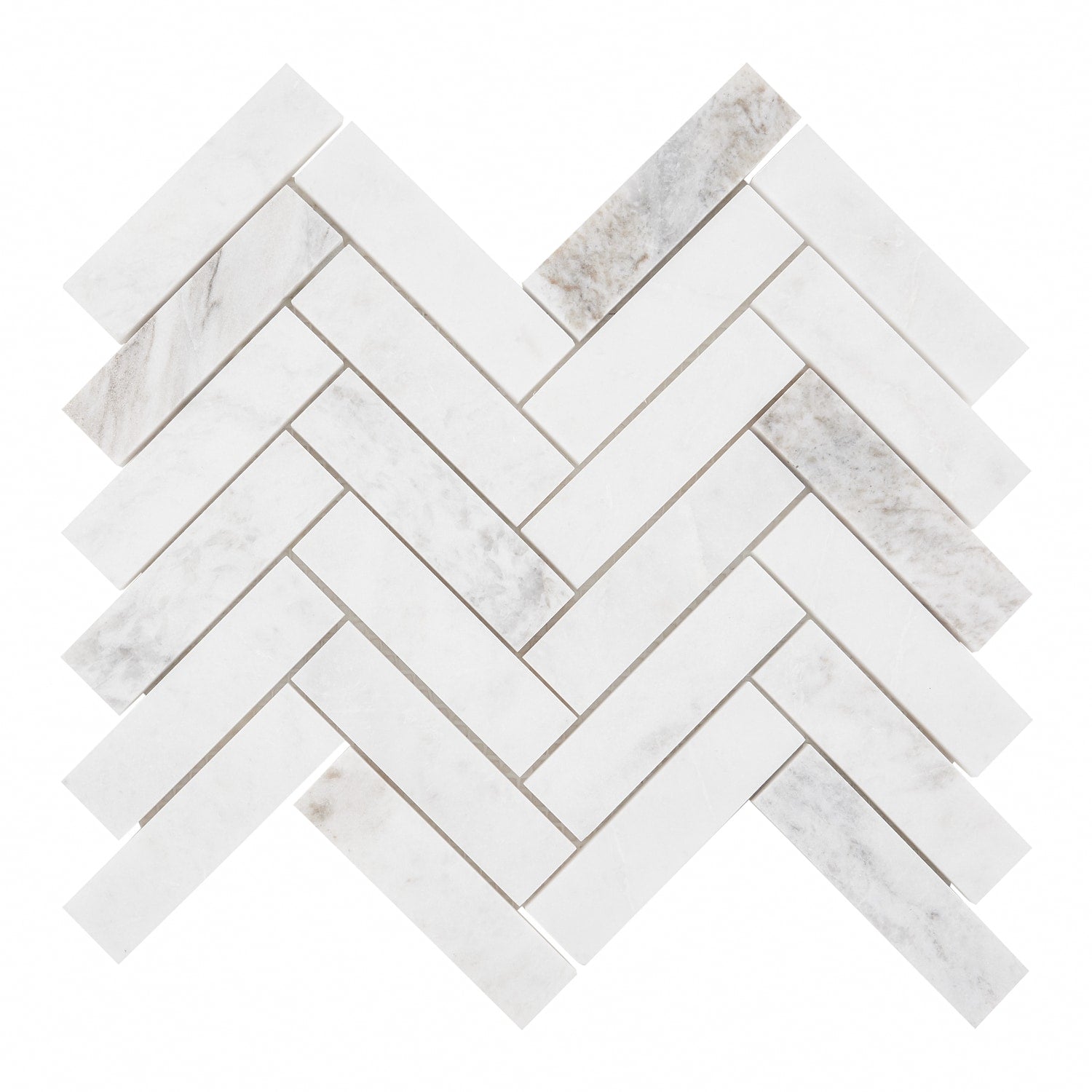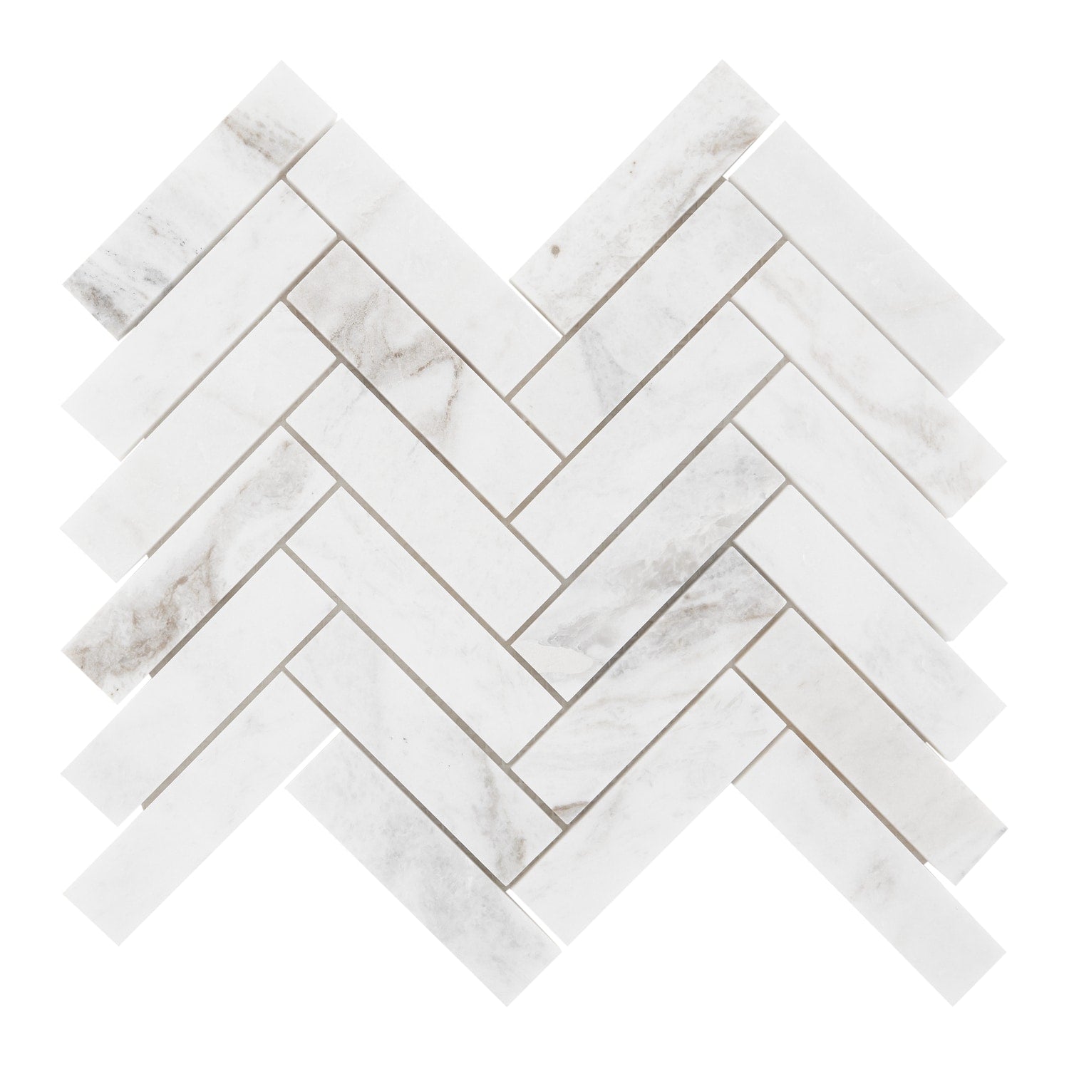 Luxurious White Ember marble arranged in a classic herringbone mosaic brings timeless elegance to floors and walls. The honed, low-sheen finish and mesh-mounted sheet simplify installation for kitchens, baths, showers, and accent walls.
