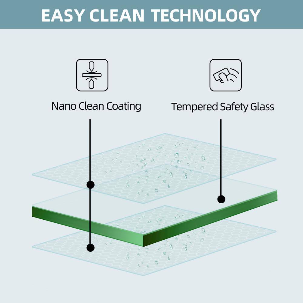 Q: Is the glass treated for easy maintenance? A: Yes, the door features a nano-structured surface that repels water and soap scum, reducing the need for frequent cleaning.