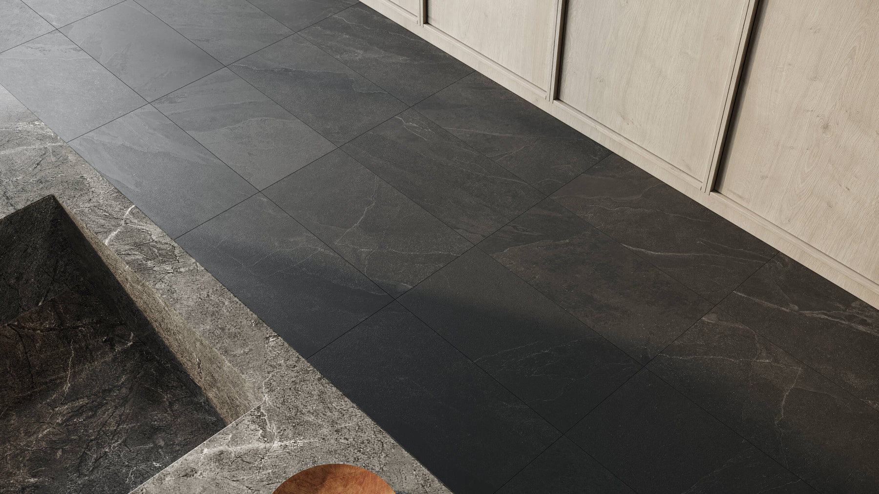 Gios Graphite envelops a room in a quiet, smoky drama—its stone-like veining softens the bold, dark canvas. The matte finish and rectified lines craft an uninterrupted rhythm across floors and walls. Pair it with pale oak, brushed nickel, and warm lighting to let its depth sing without overpowering. A refined essential for spaces that crave modern luxury and timeless calm.