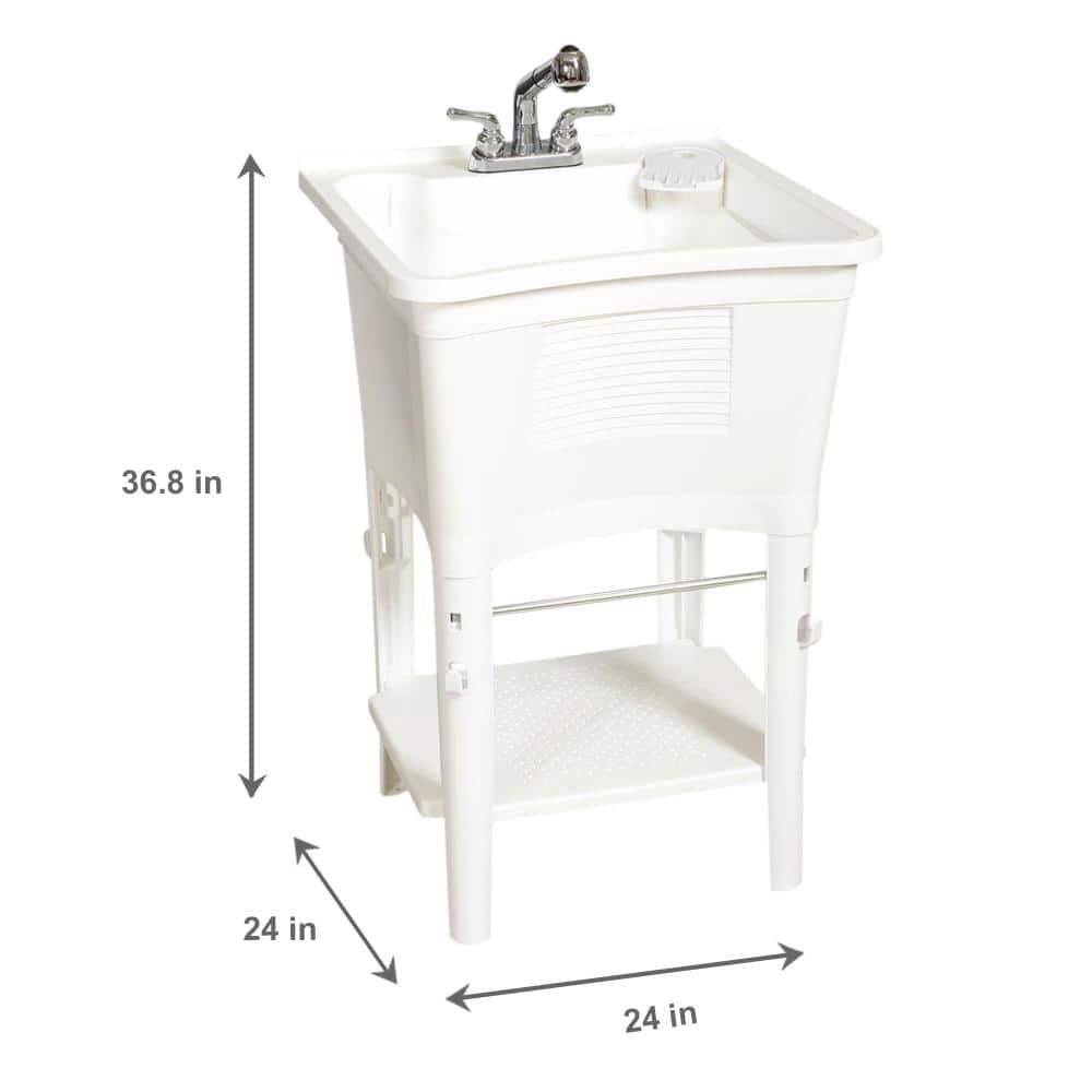 Elevate your laundry or utility space with the Glacier Bay All-in-One Freestanding Laundry Sink Work Center. This robust 20-gallon utility sink features a heavy-duty polypropylene basin with a convenient pull-out chrome faucet, integrated backsplash, and storage solutions, designed to withstand rigorous cleaning tasks.