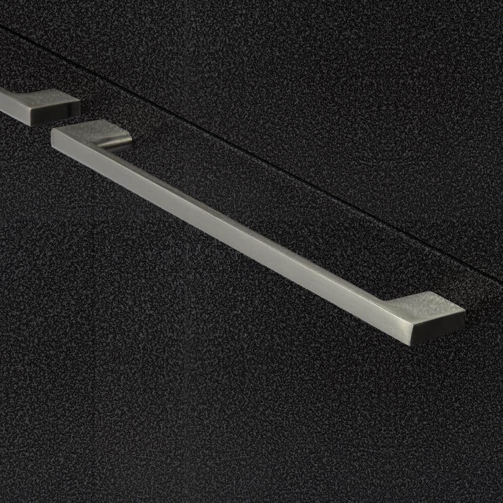 Modern Aesthetic: Brushed stainless steel and black cabinet for contemporary look.
