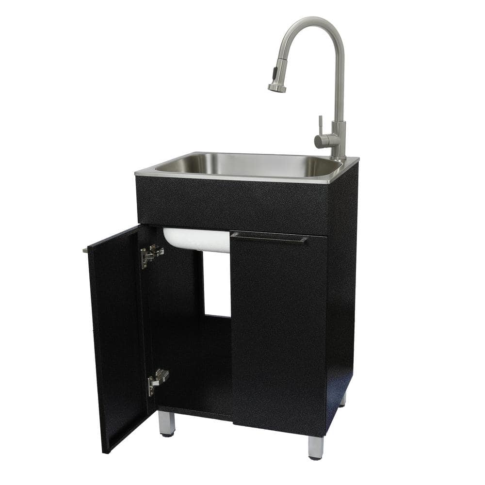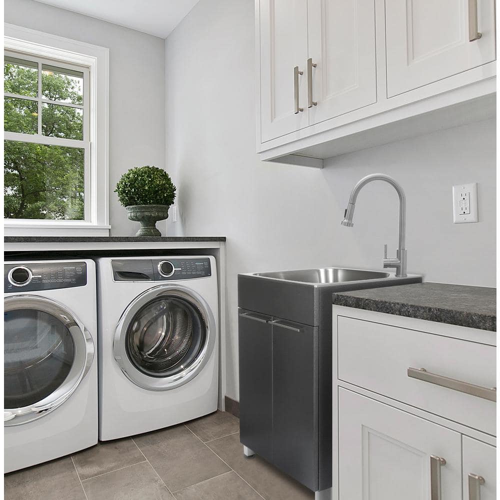 The Glacier Bay Stainless Steel Laundry Sink and Cabinet is a perfect blend of utility and elegance, transforming mundane chores into an opportunity for design indulgence. The sleek, brushed steel against the deep black cabinet delivers a striking balance of modernity and sophistication. Enhance your space by pairing this statement piece with industrial lighting and neutral tones for a chic, organized laundry room or workshop. Essential for those who demand practicality without sacrificing style, this setup redefines luxury in everyday tasks.