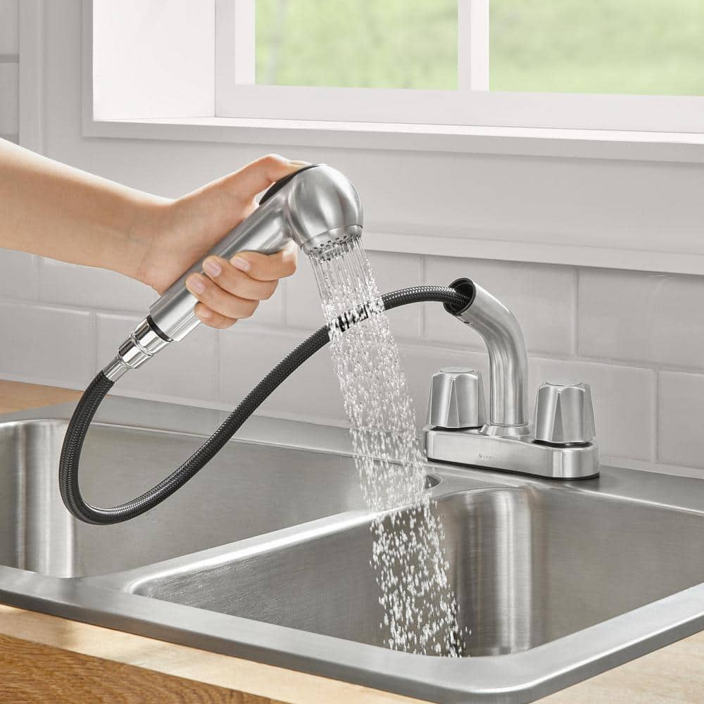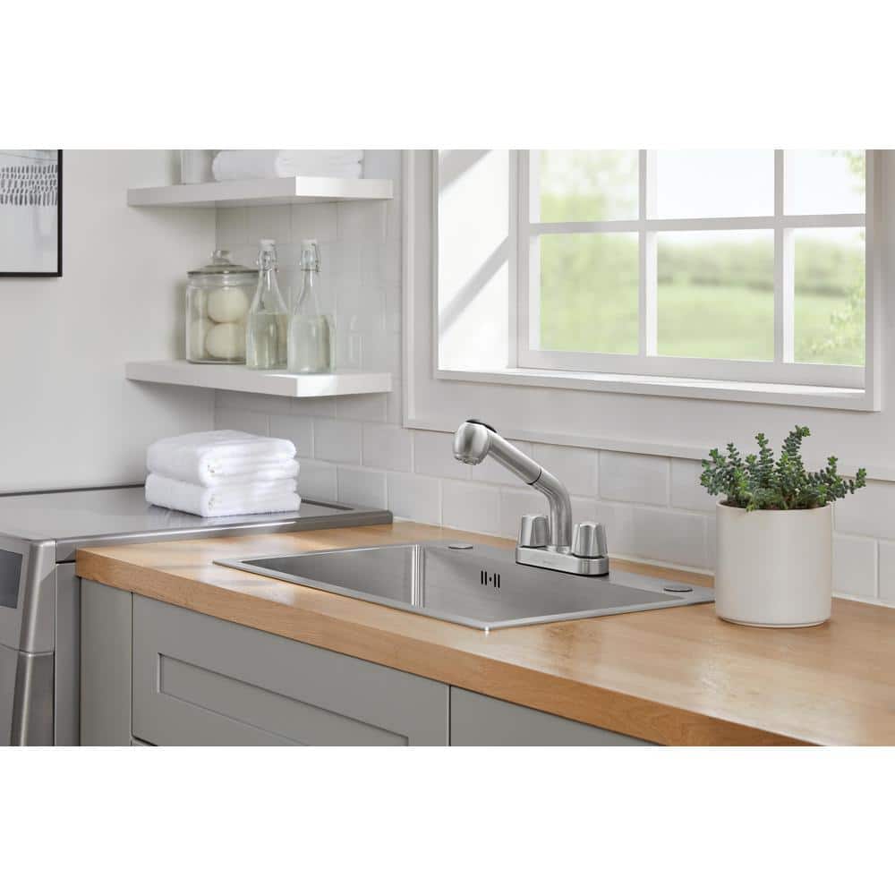 Upgrade your utility sink with the Glacier Bay Stainless Steel Pull-Out Laundry Faucet. This durable faucet features a sleek design with a 16-inch pull-out spray wand, providing versatile use with its two spray modes. Enjoy easy water temperature control with the dual handles and prevent leaks thanks to its washerless cartridge technology.