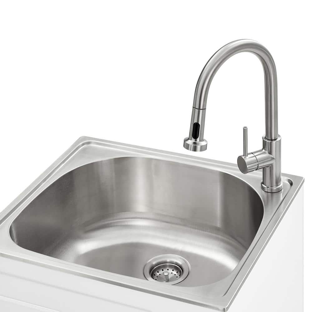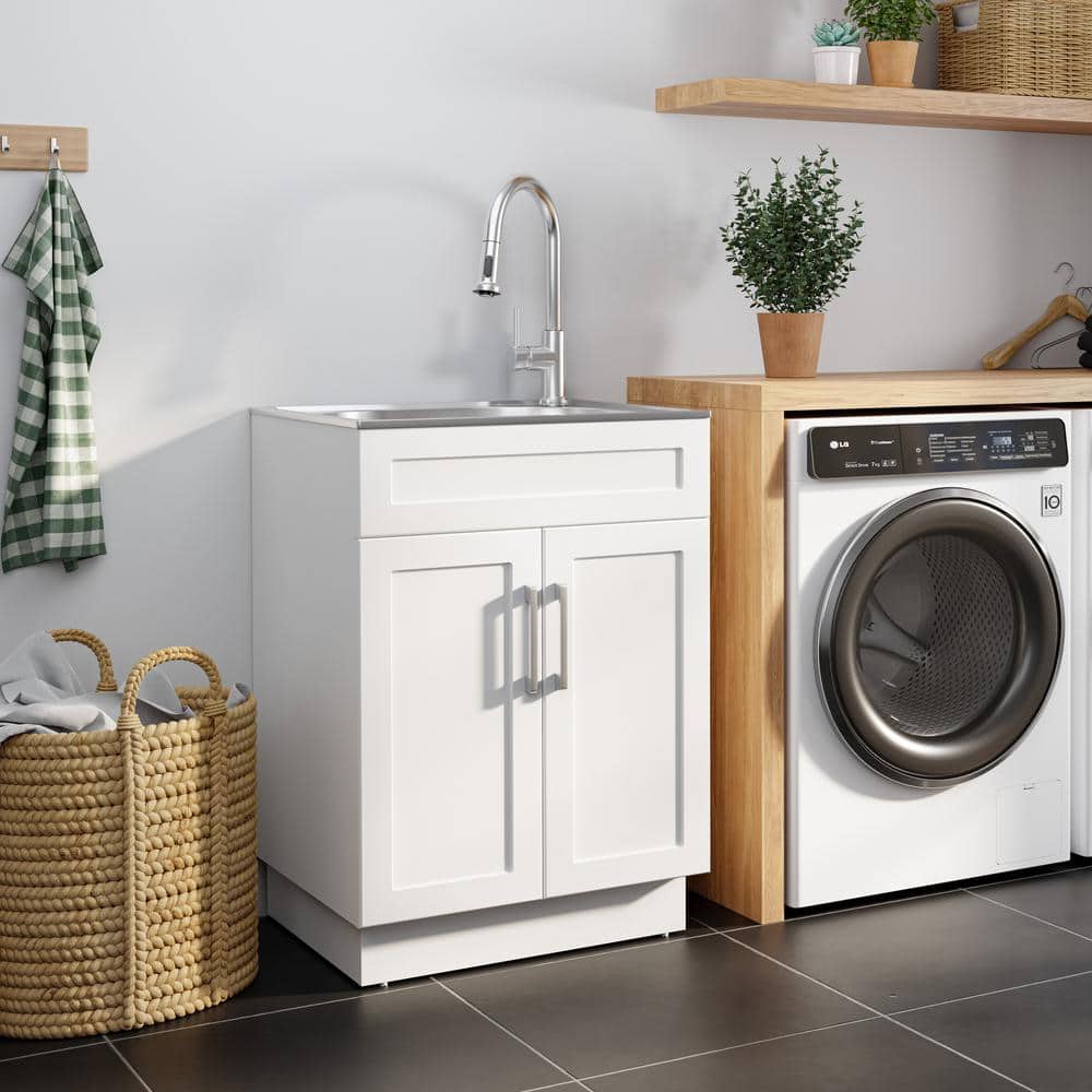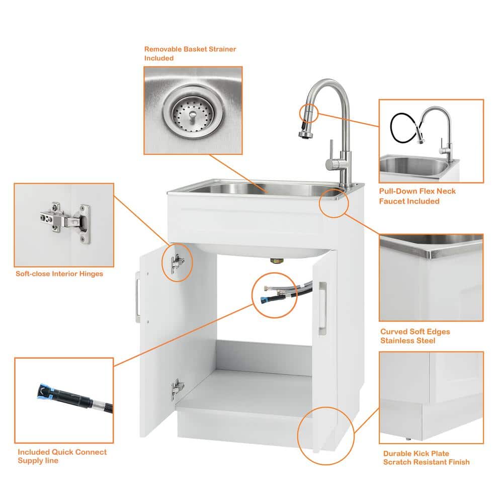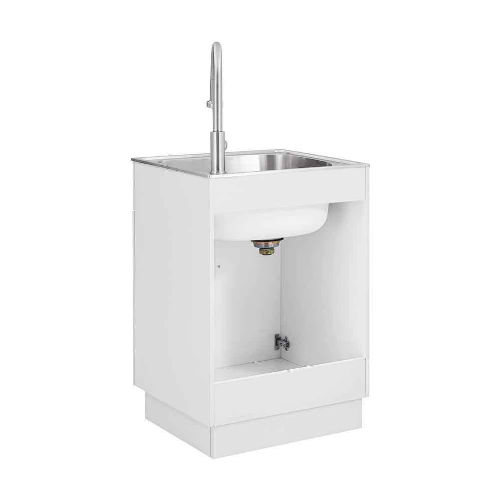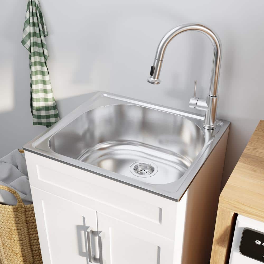 Q: Is the sink scratch resistant? A: Yes, the white finish is scratch-resistant, making it durable for busy laundry or utility rooms.