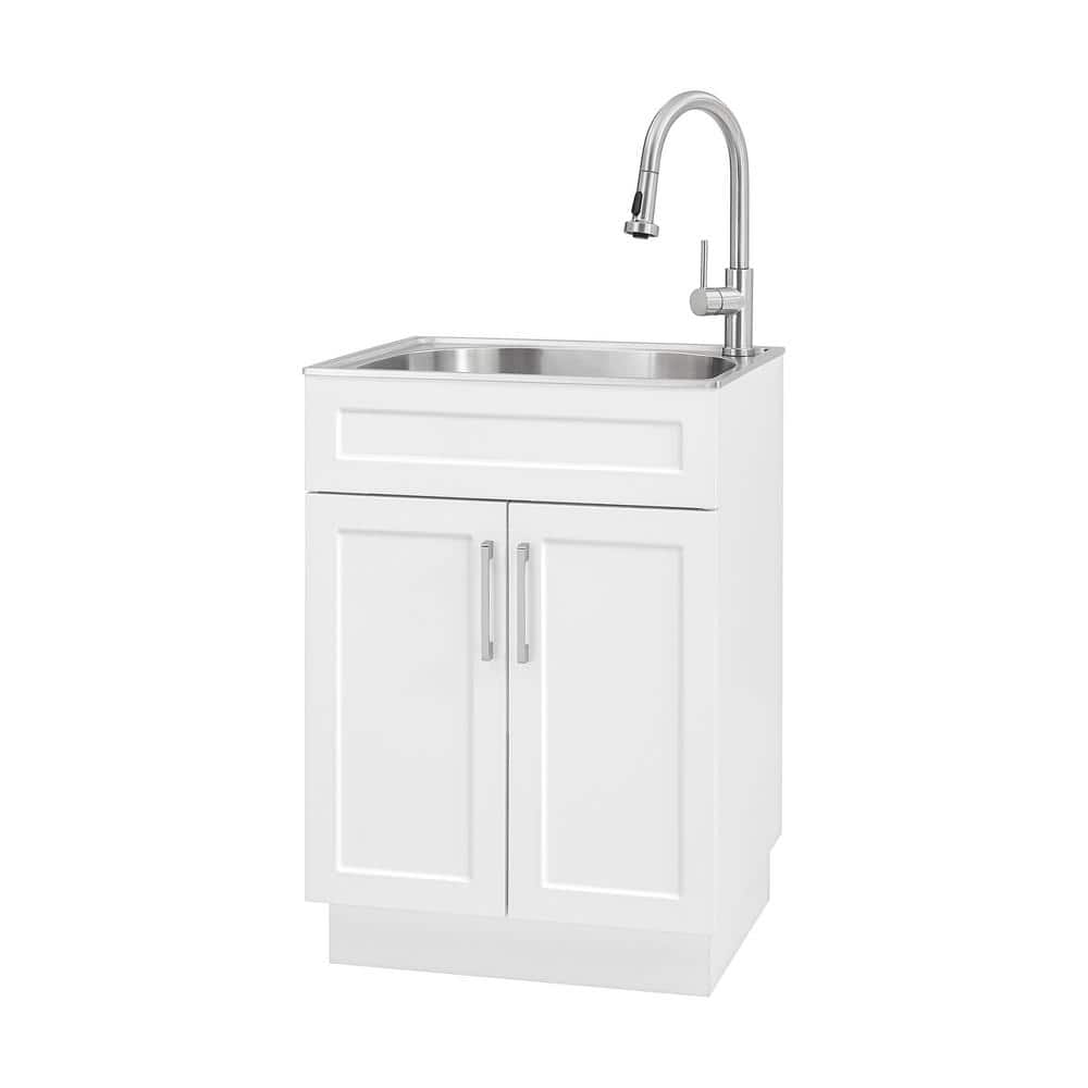 Transform your utility space with the Glacier Bay Utility Sink, where practicality meets sophisticated design. Featuring a timeless white finish and sleek brushed nickel hardware, this piece not only serves as a functional element but as a statement of style. Imagine the soft-close cabinets seamlessly storing your essentials, while the robust, stainless steel basin handles tasks with elegance. Pair with stylish baskets or verdant plants on surrounding shelves, creating a harmonious synergy of utility and luxury.