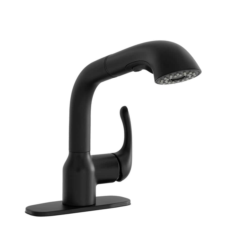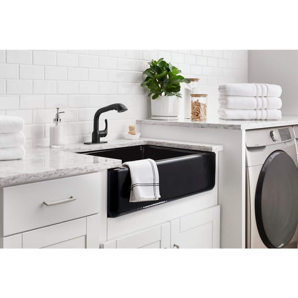 Elevate your laundry room with the Glacier Bay Dunning Matte Black Pull-Out Laundry Faucet. Featuring a two-function spray head and durable ceramic disc valves, this stylish faucet ensures easy operation and long-lasting performance.