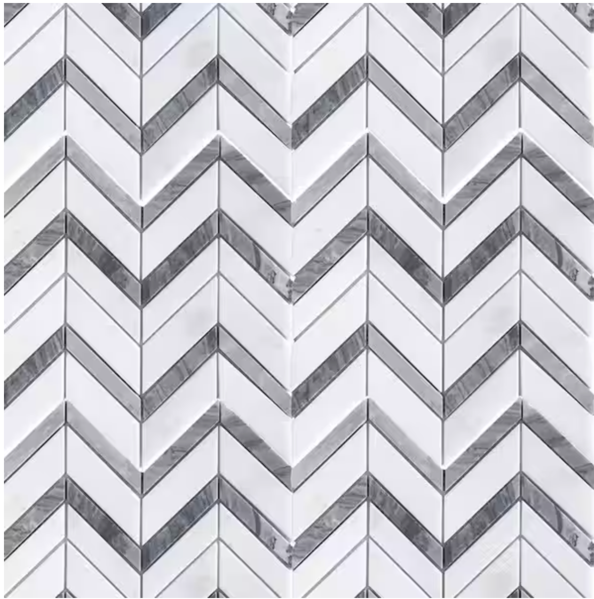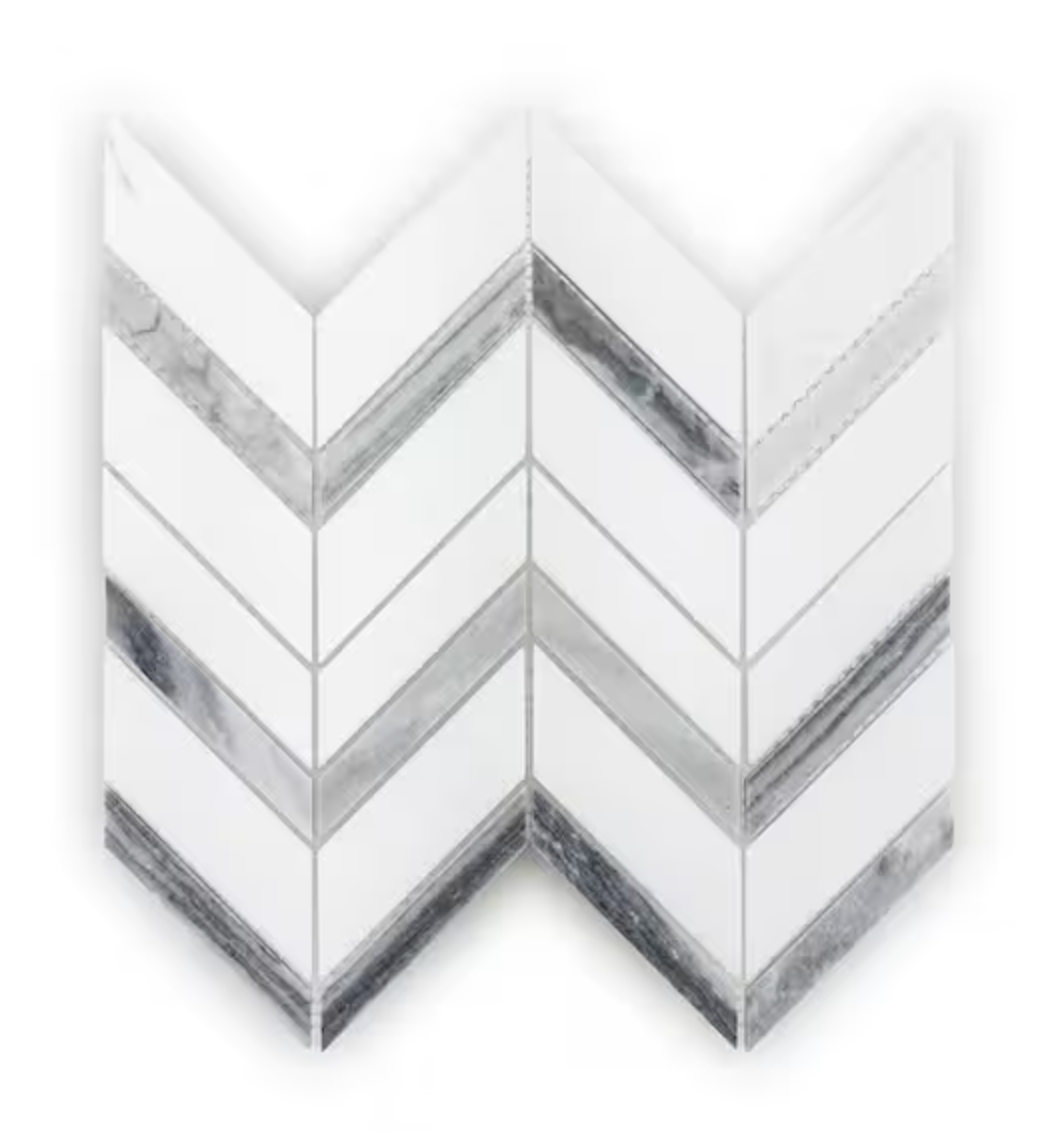 Elevate your space with Glacier Edge White and Gray Chevron Honed Marble Mosaic Tile. Each 9.875 in. x 11.25 in. tile exudes elegance and sophistication, perfect for elevating your floors or walls. With a polished finish and durable construction, this tile offers both style and strength. Transform your space with this stunning addition.