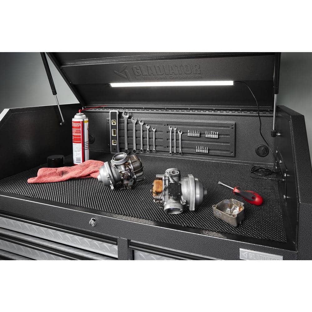 Upgrade your workshop with the Gladiator 41 in. 15-Drawer Mobile Tool Chest Combo. Built from durable welded steel, this heavy-duty storage solution can support up to 1500 lbs. Its 15 soft-close drawers, each accommodating up to 100 lbs., are lined to protect your tools, while the integrated power strip and USB ports keep your devices charged and ready.