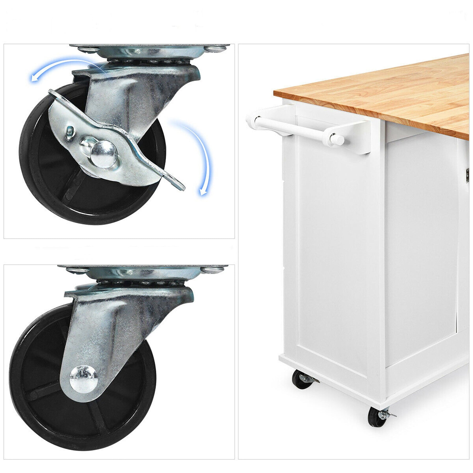 Elevate your kitchen's functionality with the Goplus Rolling Kitchen Cart. Featuring a solid rubberwood countertop and a white wood base, this versatile cart offers ample storage with adjustable shelves and easy-to-access drawers. Its contemporary design and mobility make it a must-have for any modern kitchen.