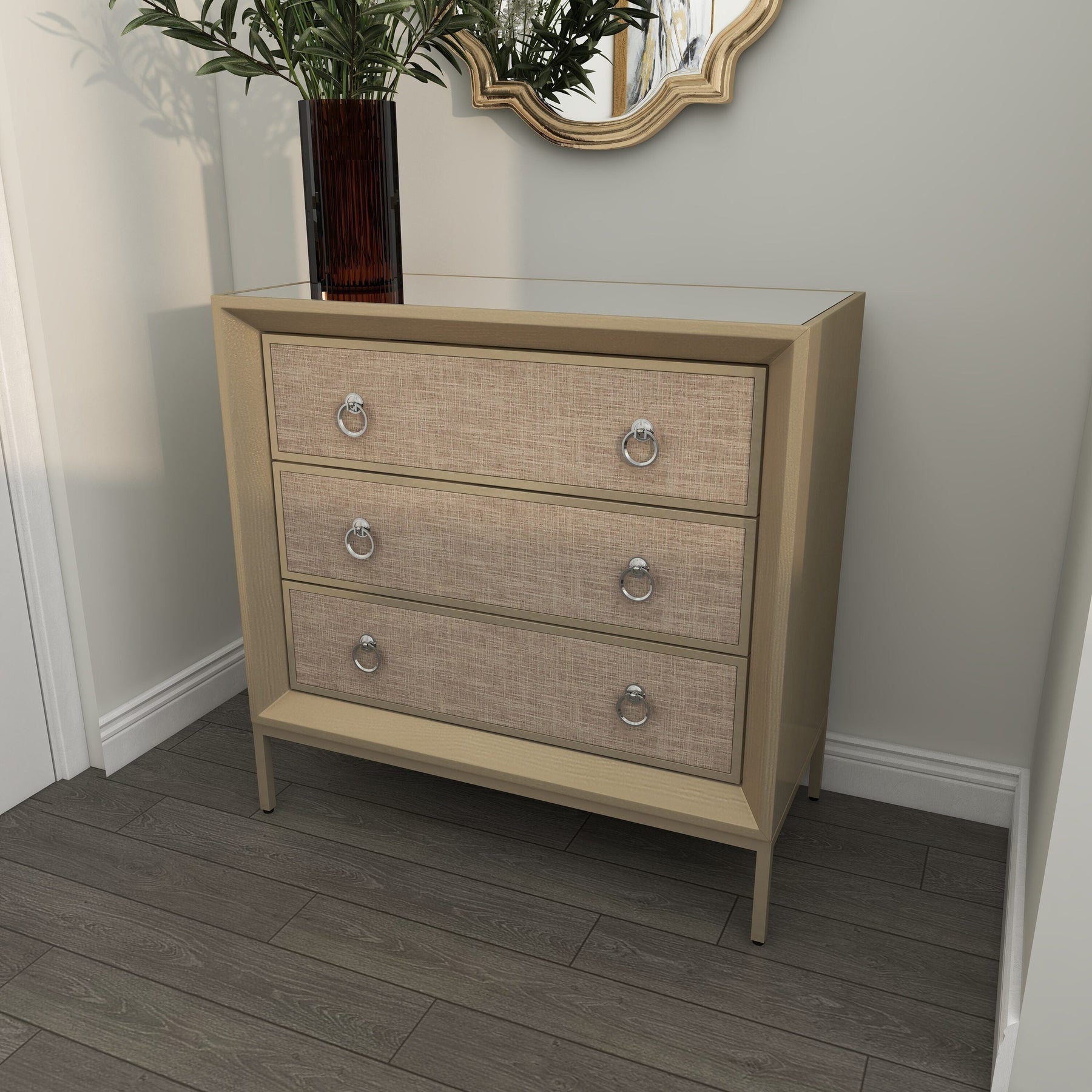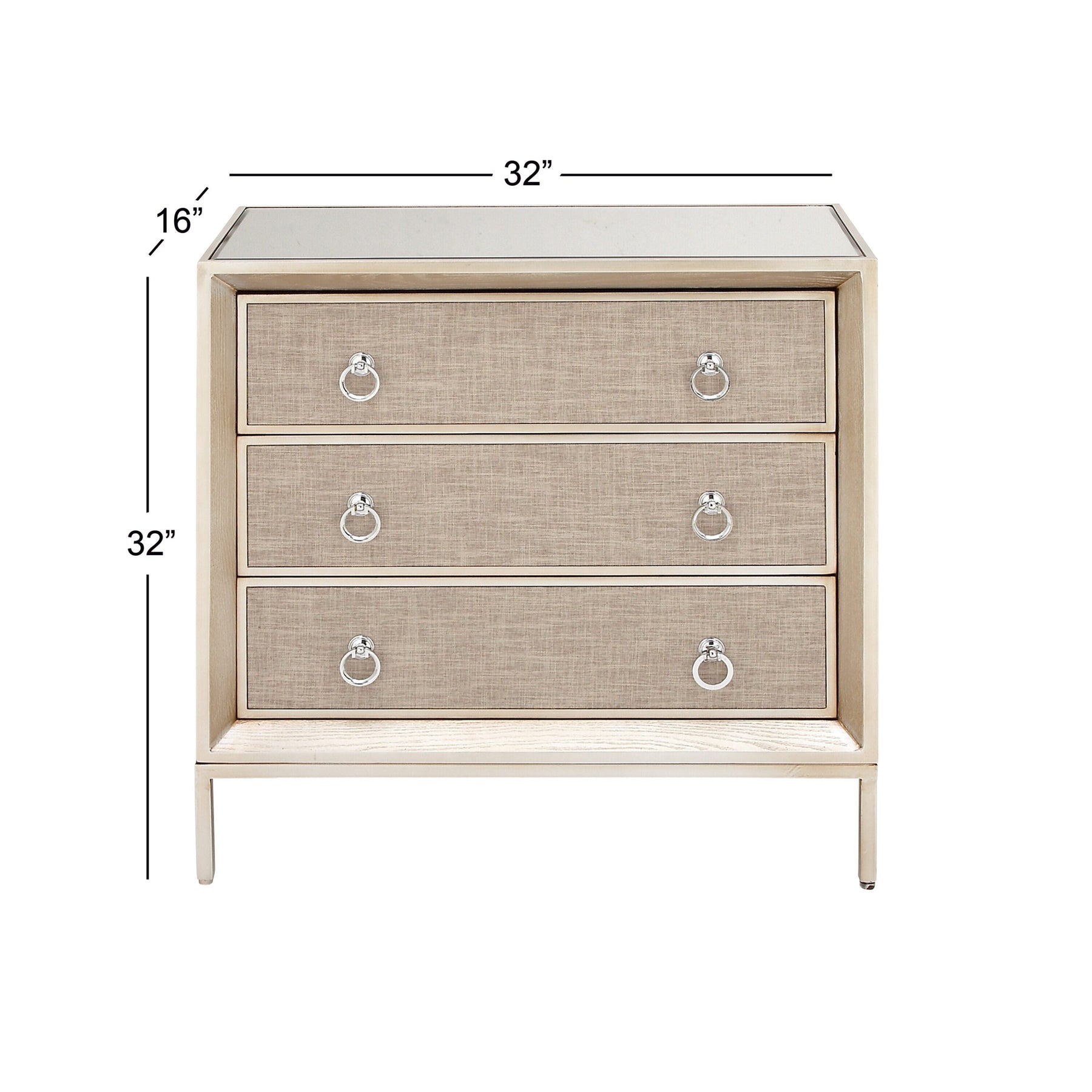 Enhance your home with the Grayson Lane Beige Upholstered Mirrored 3-Drawer Chest—a luxurious blend of plush textures and sleek finishes. This elegant accent piece, crafted from MDF, Chinese fir wood, and reflective glass, delivers both functionality and sophistication. Ideal for a glamorous home, it features spacious storage with a mirrored top for reflective beauty.