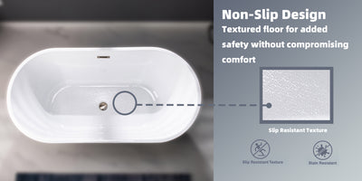 A contemporary freestanding soaking tub crafted from high‑gloss white acrylic reinforced with fiberglass and resin. The double‑slipper design features a textured non‑slip floor and matching brushed gold overflow and drain, delivering style, safety, and easy maintenance.