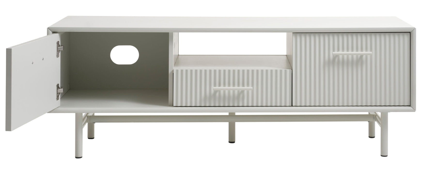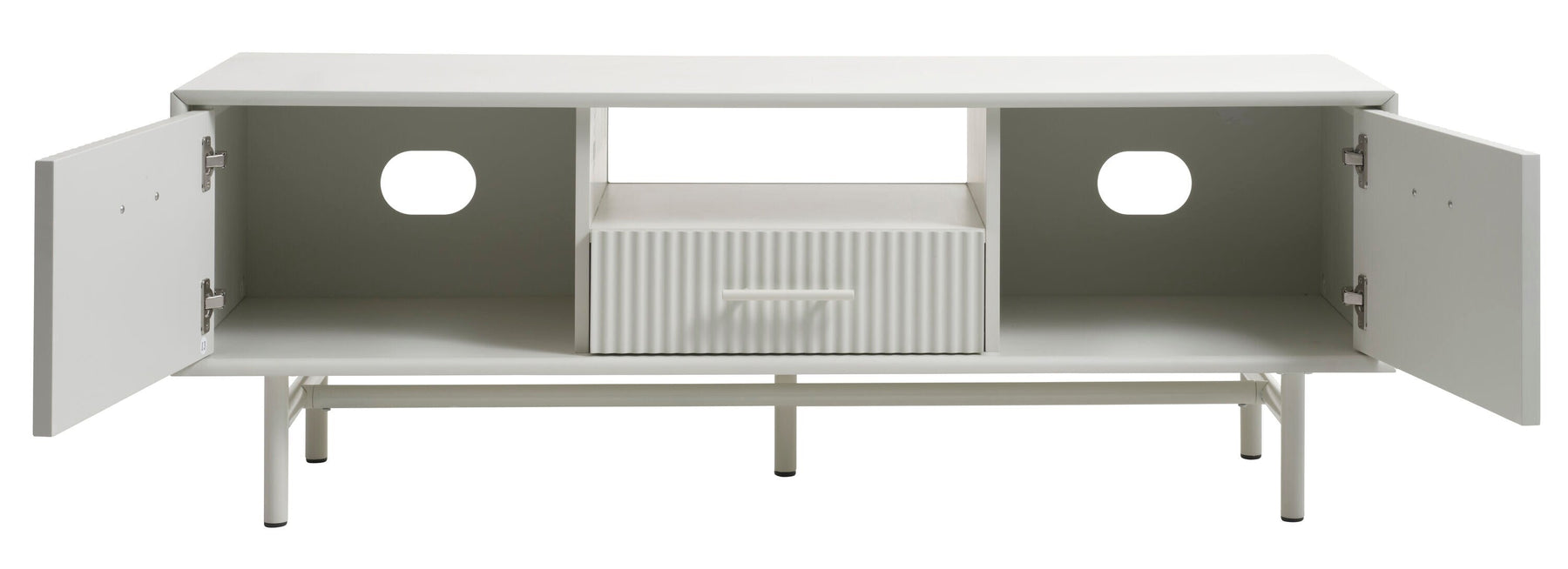 Elevate your living space with the Greige Modern MDF Media Cabinet, a blend of smooth satin lacquer and intricately grooved wood for a sophisticated aesthetic. This freestanding piece offers ample storage with its dual-door configuration and drawer, complete with elegant metal legs and handles in a soft matte finish.