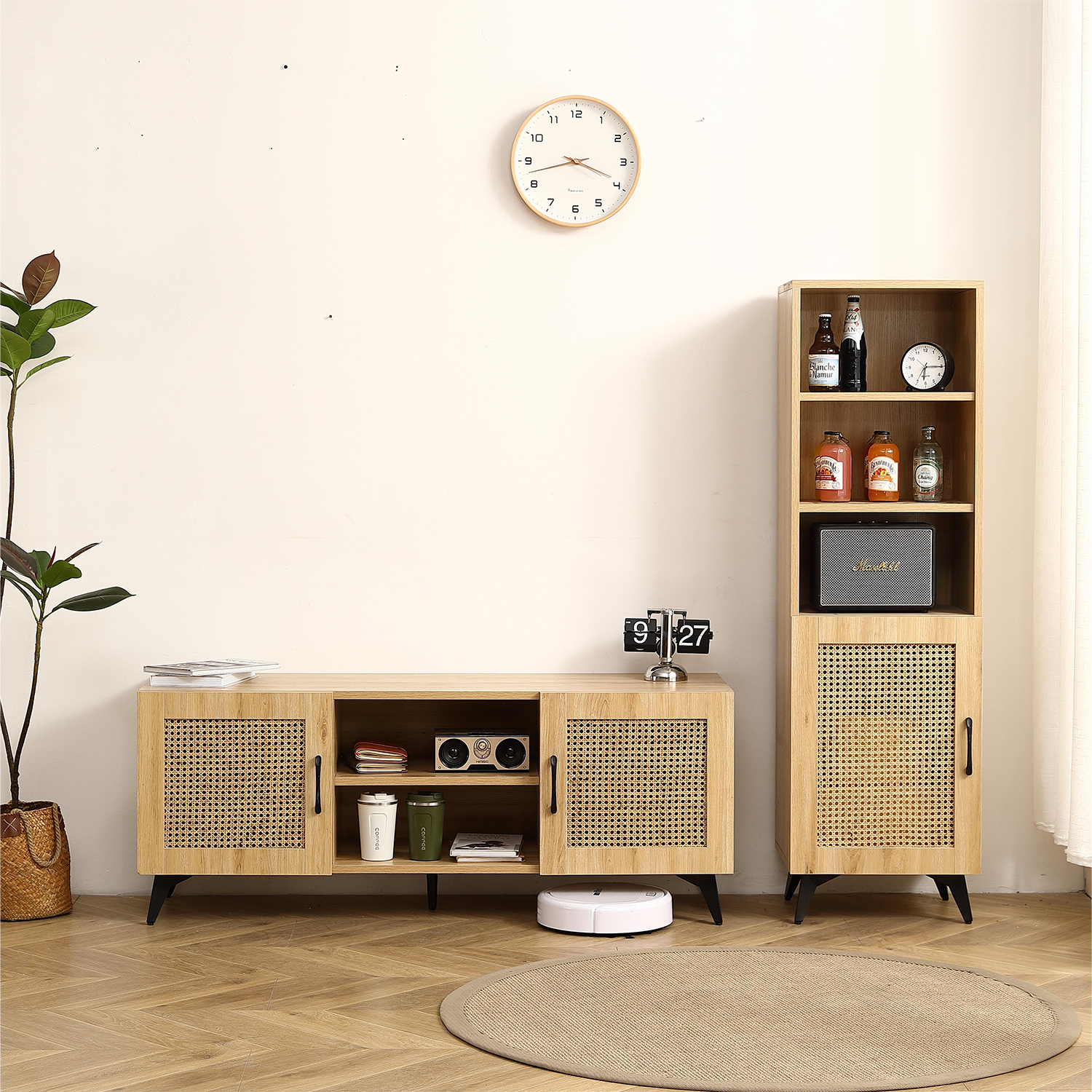 A: Its sleek, minimalistic design with a unique rattan mesh door suits contemporary and modern decor styles effortlessly.