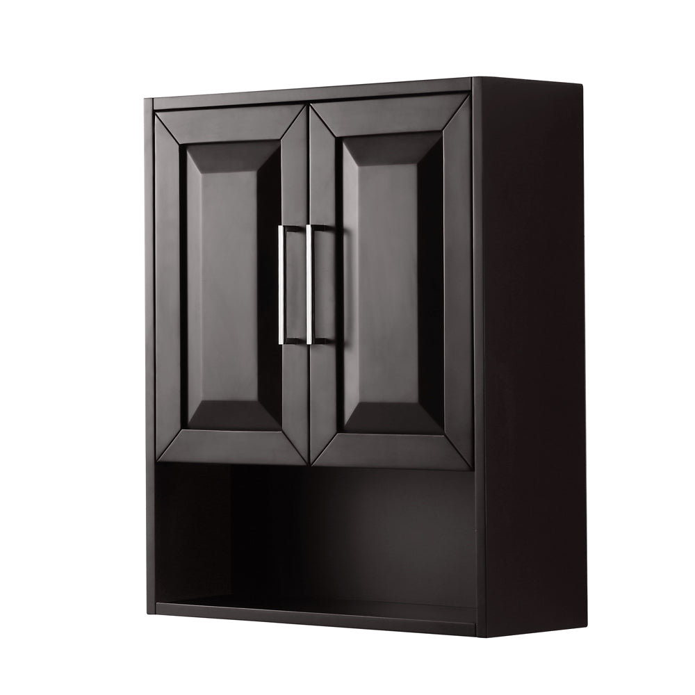 A sleek over-toilet wall cabinet from Wyndham Collection’s Daria line, finished in Dark Espresso. Built from solid wood, plywood and MDF with a water-resistant, low-VOC finish, it adds concealed storage plus an open shelf in a compact 25 x 9 x 30 in. footprint.