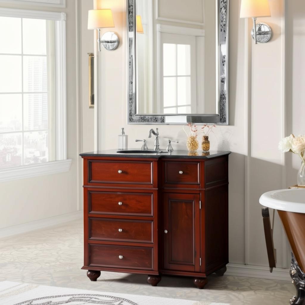 Transform your bathroom into a sanctuary of sophistication with the Hampton Harbor Bath Vanity. Its Sequoia wood finish and black granite top exude timeless elegance, while the tapered ball feet add a touch of classic charm. Pair it with a sleek chrome faucet to enhance its refined aesthetic. This vanity is not just a functional piece but a statement of luxurious living.