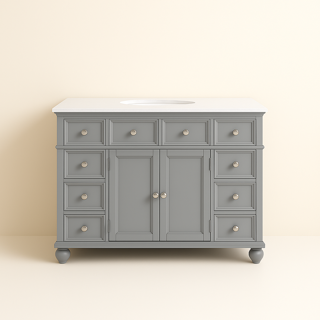 Elevate your bathroom's aesthetic with this exquisite vanity, blending timeless design with modern functionality. The dove grey finish and natural marble top create a sophisticated focal point, while the ample storage ensures practicality. Pair it with polished chrome fixtures and soft lighting to enhance its elegance. This piece is a must-have for those seeking to combine luxury with everyday convenience.