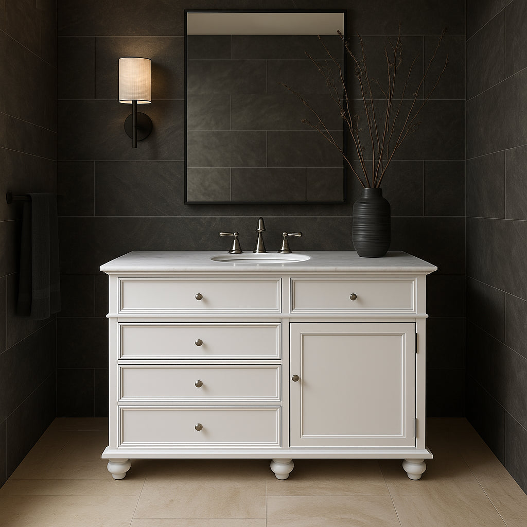 Transform your bathroom into a sanctuary of sophistication with the Hampton Harbor Vanity. Its clean lines and crown molding exude timeless elegance, while the natural marble top adds a touch of luxury. Pair it with a sleek chrome faucet to enhance its refined aesthetic. This vanity is not just a functional piece but a statement of style, perfect for elevating your bathroom decor.
