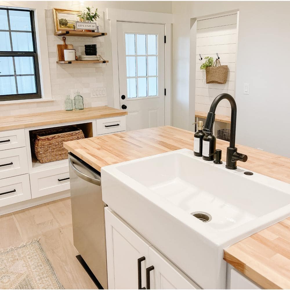 Q: How do I finish the butcher block countertop? A: You can finish the countertop by staining it to your preferred color, then sealing it to protect against moisture and wear. Ensure you seal it within 24 hours of installation for best results.