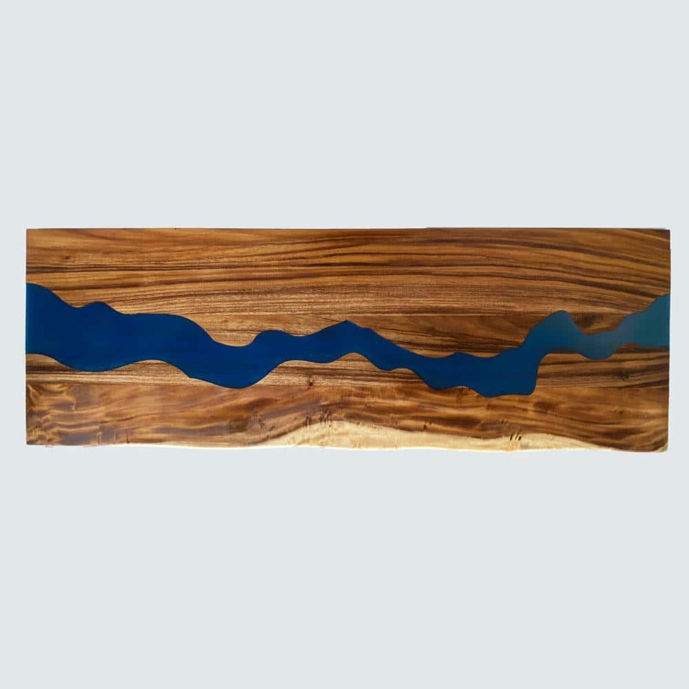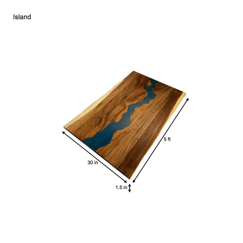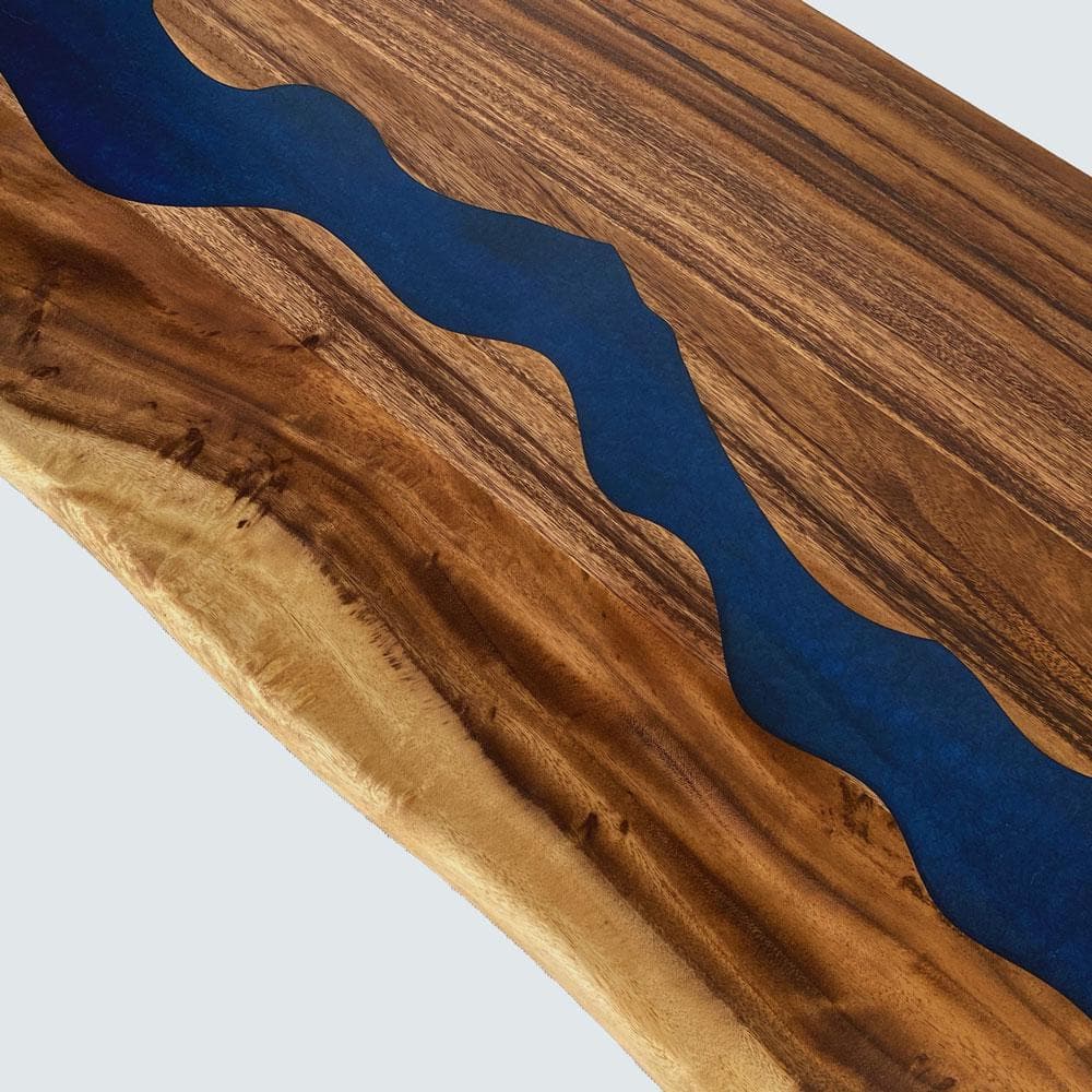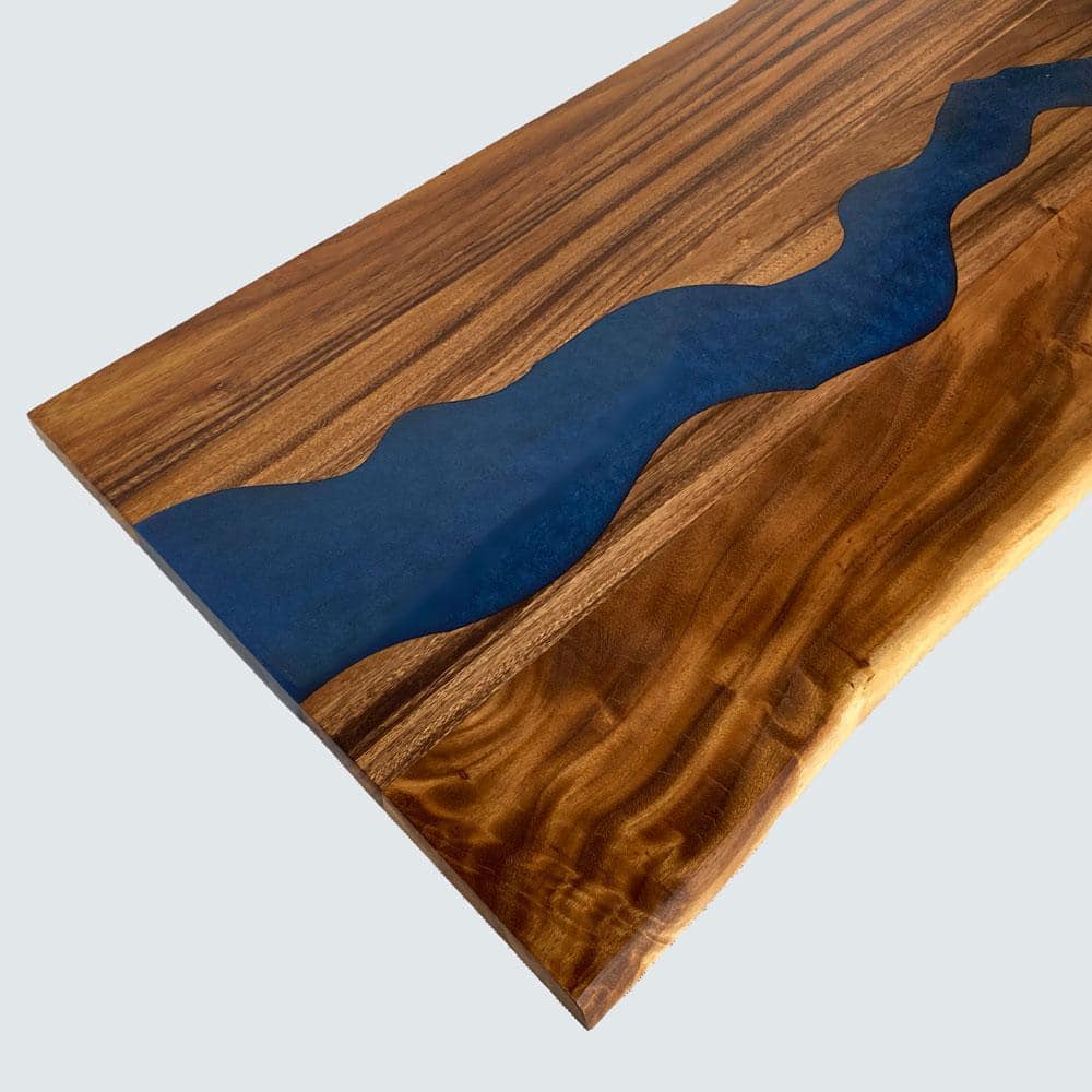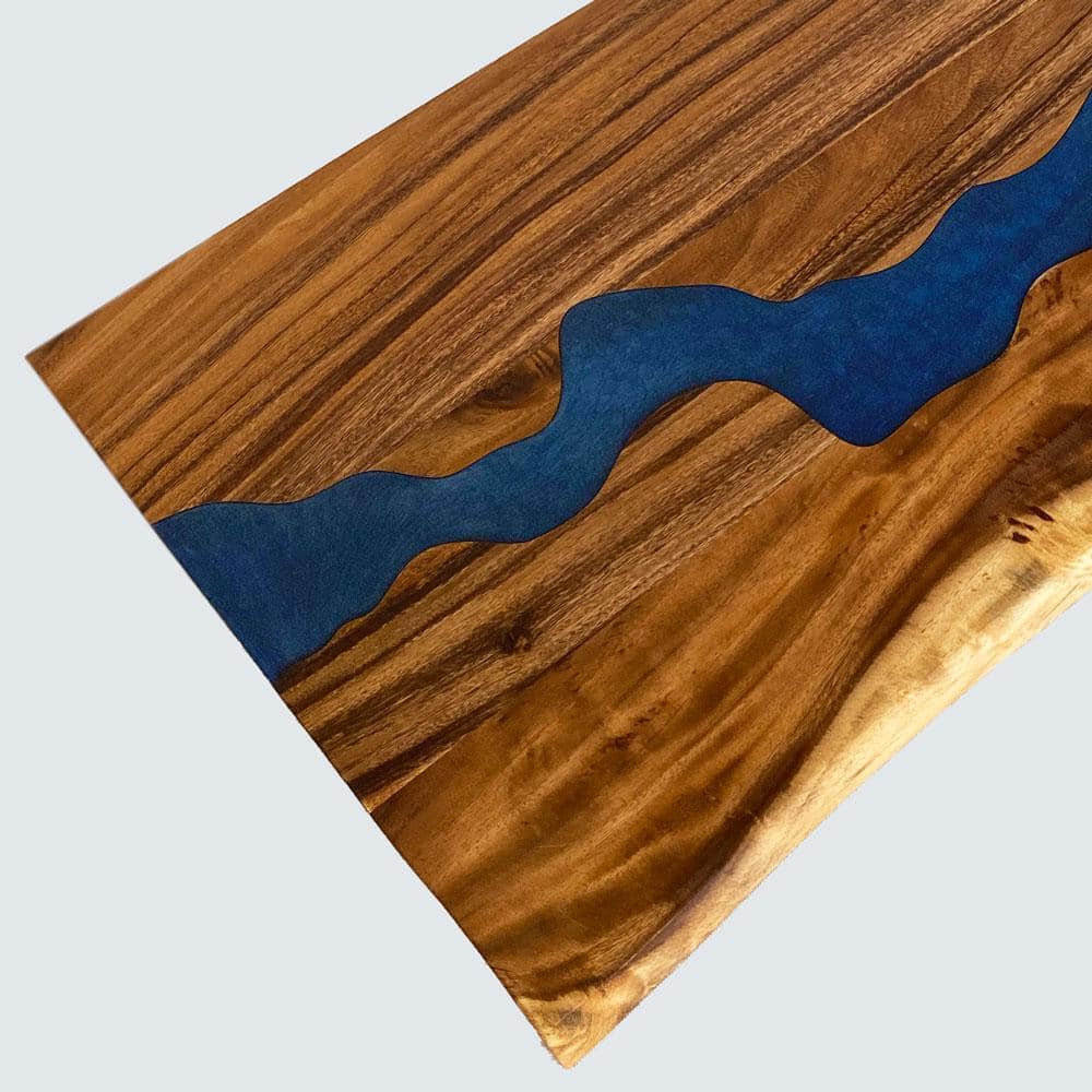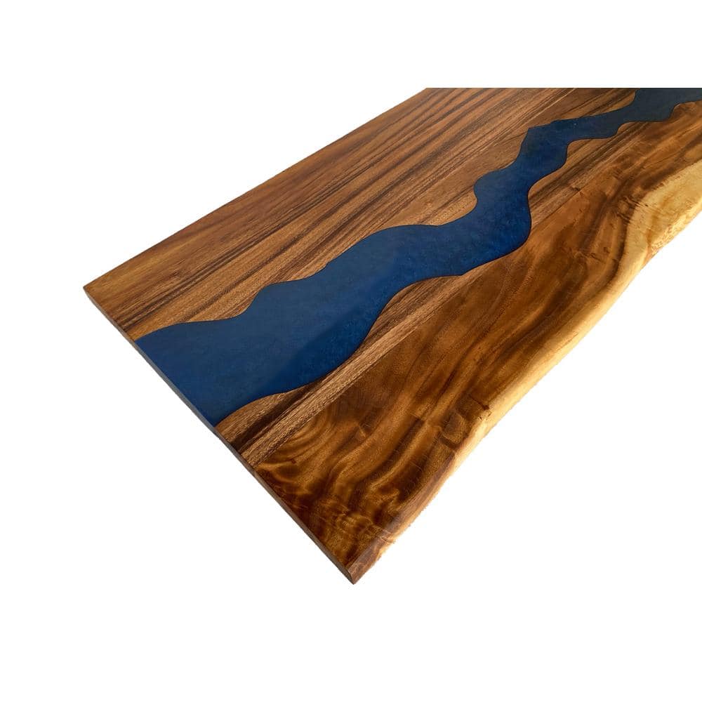 Enliven your living space with the mesmerizing allure of the Live Edge Saman Butcher Block Countertop. Its rich, golden hues and striking blue epoxy river guide the eye through a symphony of natural beauty. Pair it with rustic decor for a charming juxtaposition, or let it anchor a minimalist setting for a dramatic statement. This piece transcends mere functionality, manifesting as an artful essential in luxurious, conscious living.