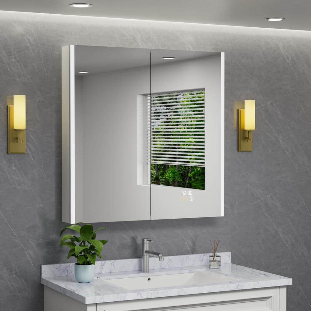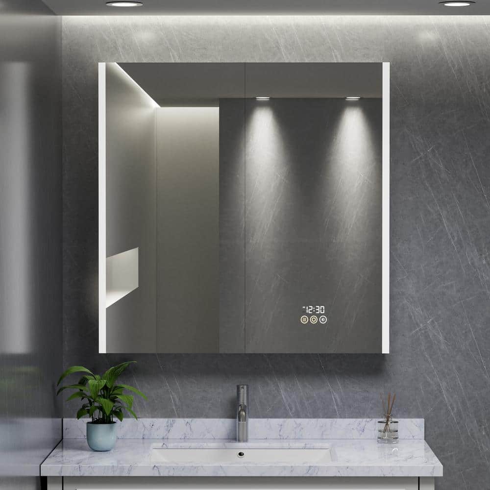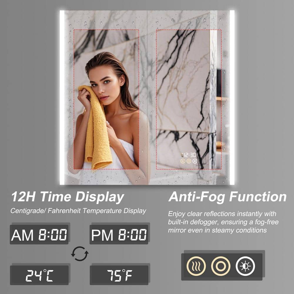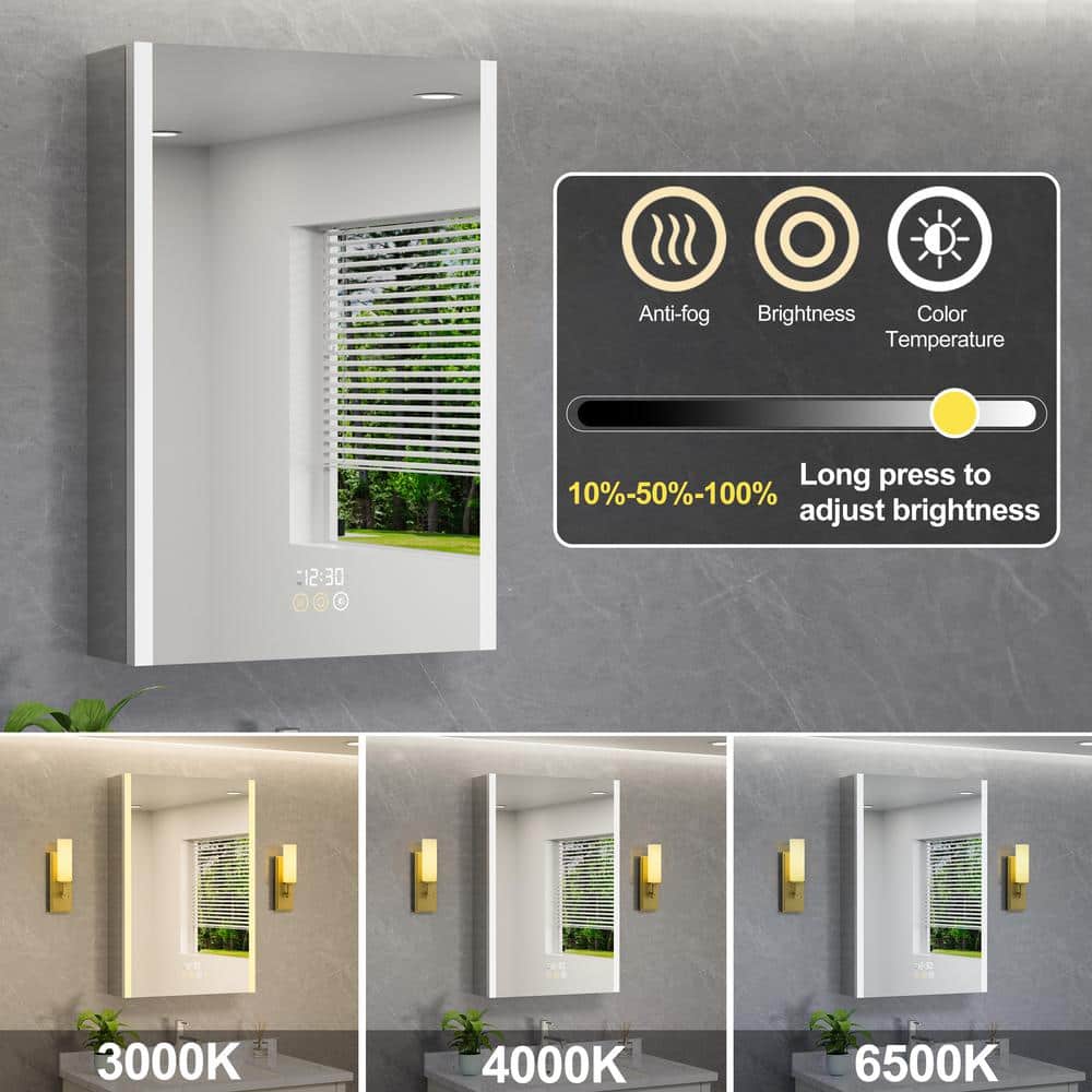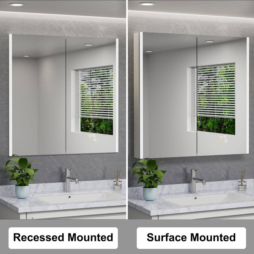 The HBEZON Eos Medicine Cabinet is a sleek and modern storage solution that combines functionality with elegance. Featuring adjustable LED lighting, an anti-fog mirror, and a built-in LED clock, this cabinet provides convenient access to grooming essentials. With the flexibility of surface or recessed installation, it adds sophistication and practicality to any bathroom setting.