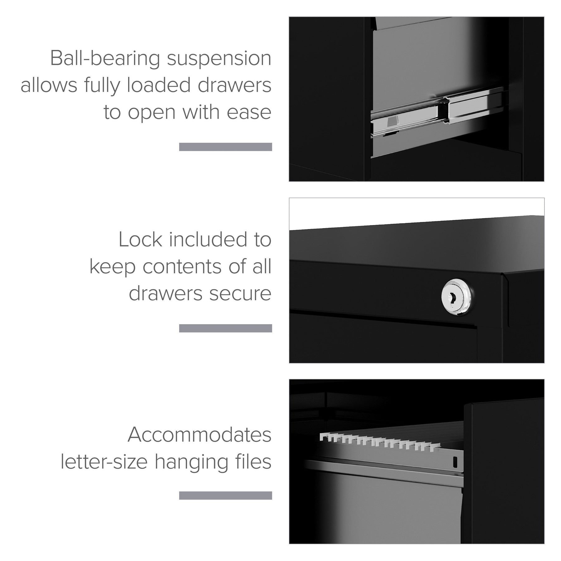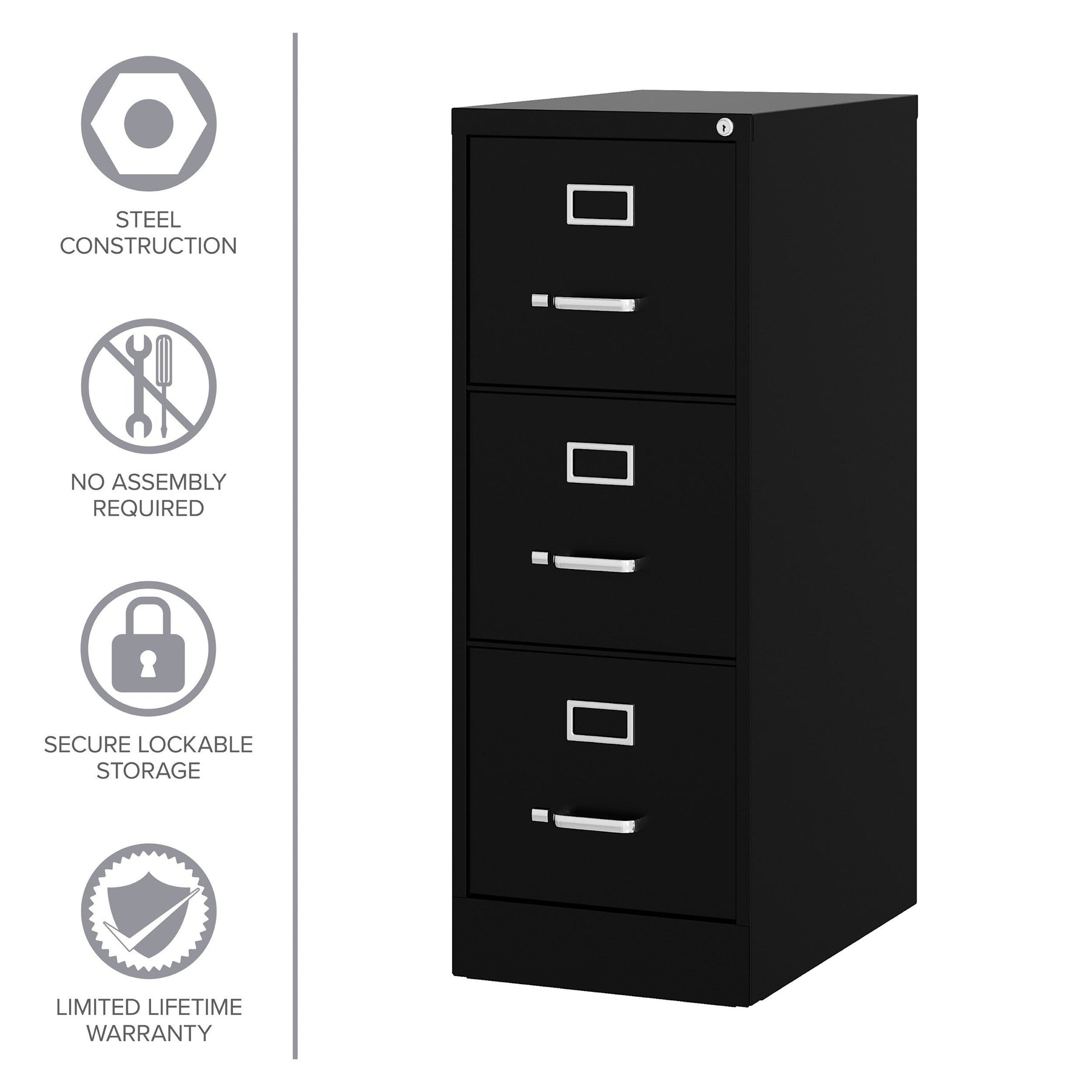 The Hirsh 3-Drawer File Cabinet offers secure, organized storage for your office needs with its durable steel construction and smooth ball-bearing slides. Its sleek black finish and practical design make it a perfect addition to any professional or home office setting.