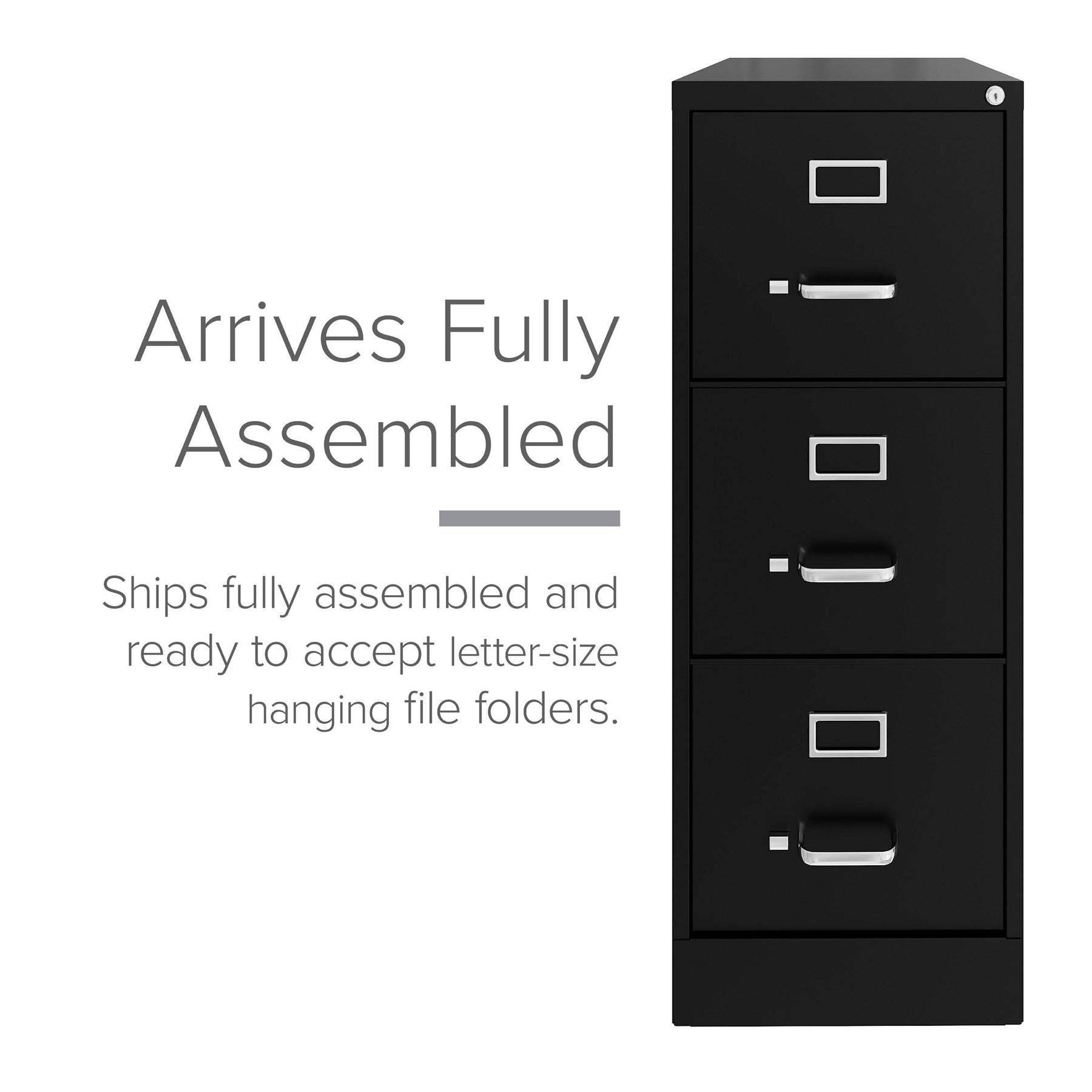 Q: Does this file cabinet require assembly? A: No, the Hirsh 3-Drawer File Cabinet comes fully assembled, ready for immediate use.