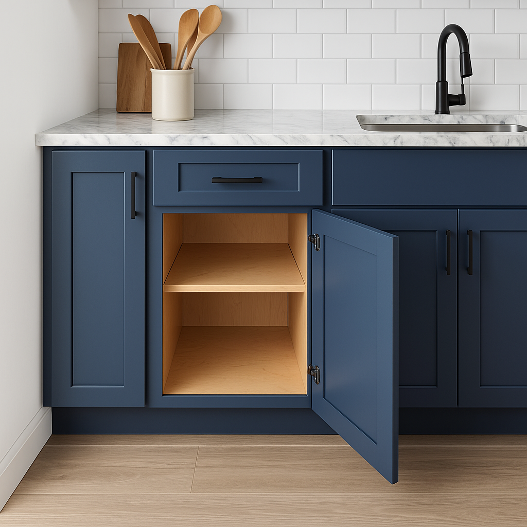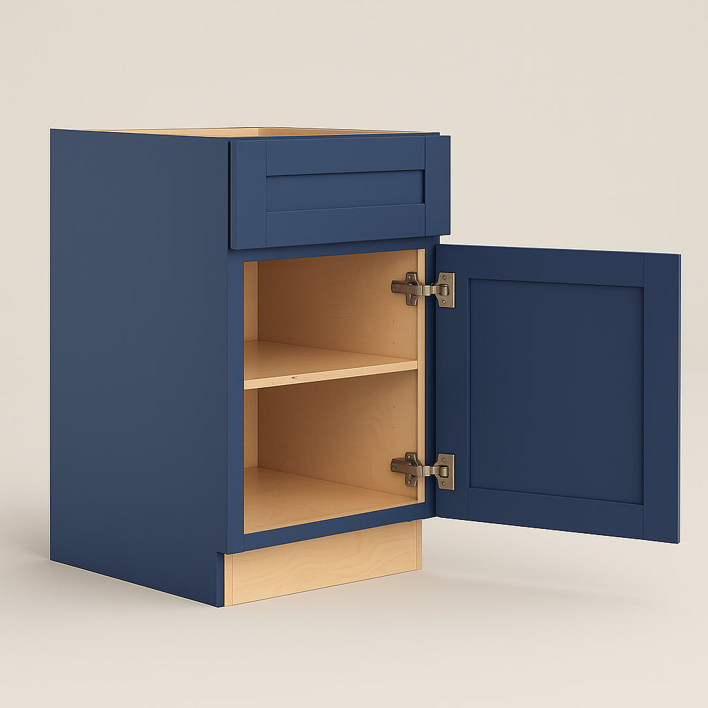 The Washington Vessel Blue Shaker Base Cabinet combines modern design with durable construction. Featuring a deep blue vinyl finish, soft-close technology, and CARB II compliant plywood, this cabinet offers both style and functionality for your kitchen.