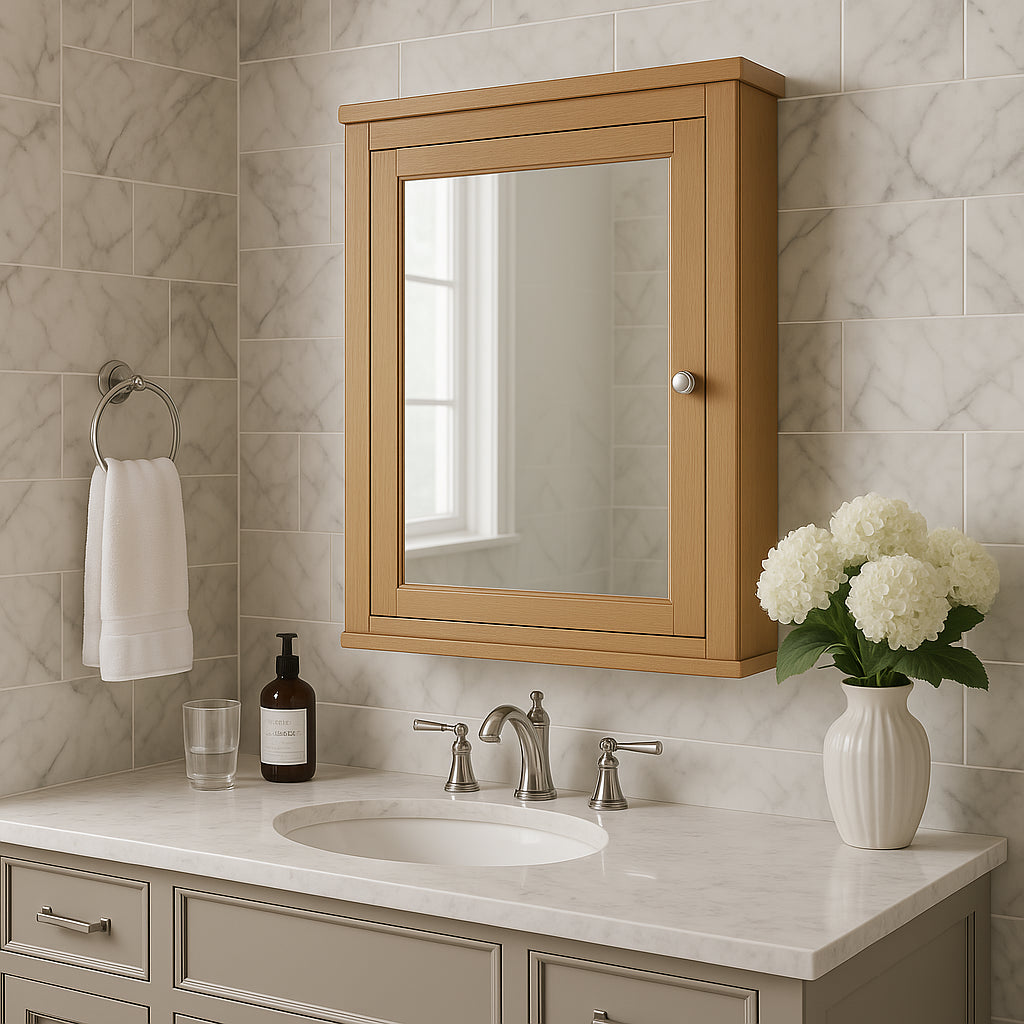 The Aberdeen Antique Oak Medicine Cabinet combines timeless design with practical functionality. Featuring a mirrored door, soft-close mechanism, and ample storage, it is perfect for organizing bathroom essentials while enhancing your decor.