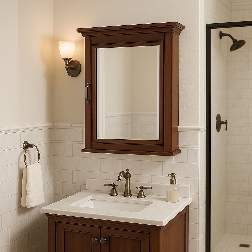 The Ashburn Medicine Cabinet is a masterpiece of bathroom design, blending functionality with timeless elegance. Its rich mahogany finish and intricate crown molding create a luxurious focal point, while the adjustable shelves provide versatile storage solutions. Pair it with marble countertops and oil-rubbed bronze fixtures to complete a sophisticated look. This cabinet is not just a storage solution but a statement piece that transforms your bathroom into a sanctuary of style.