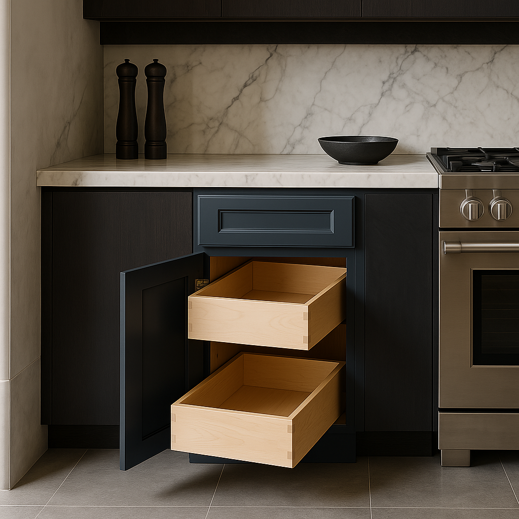 - Optimized Storage: Equipped with two roll-out trays and a spice tray insert for organized storage.